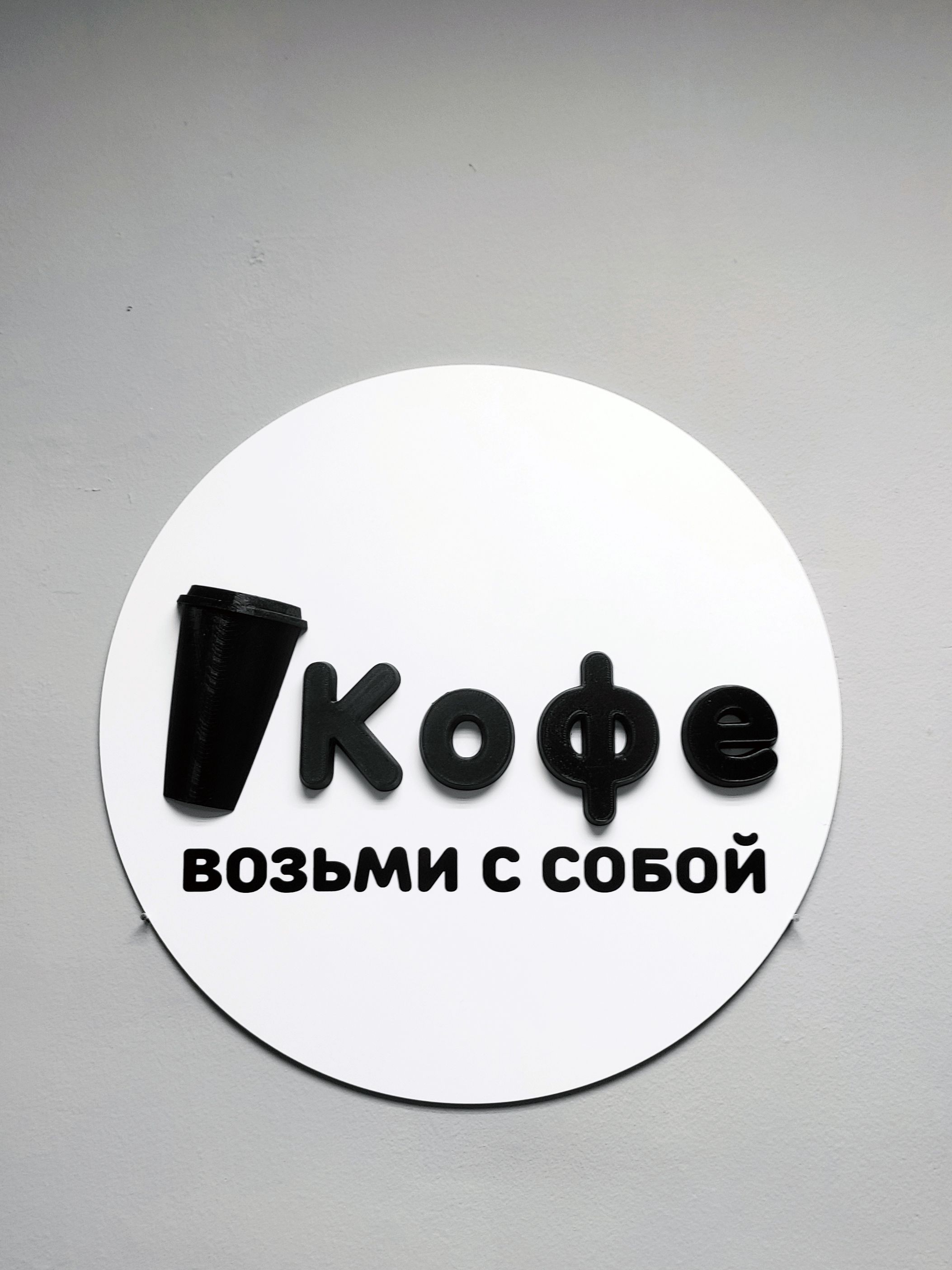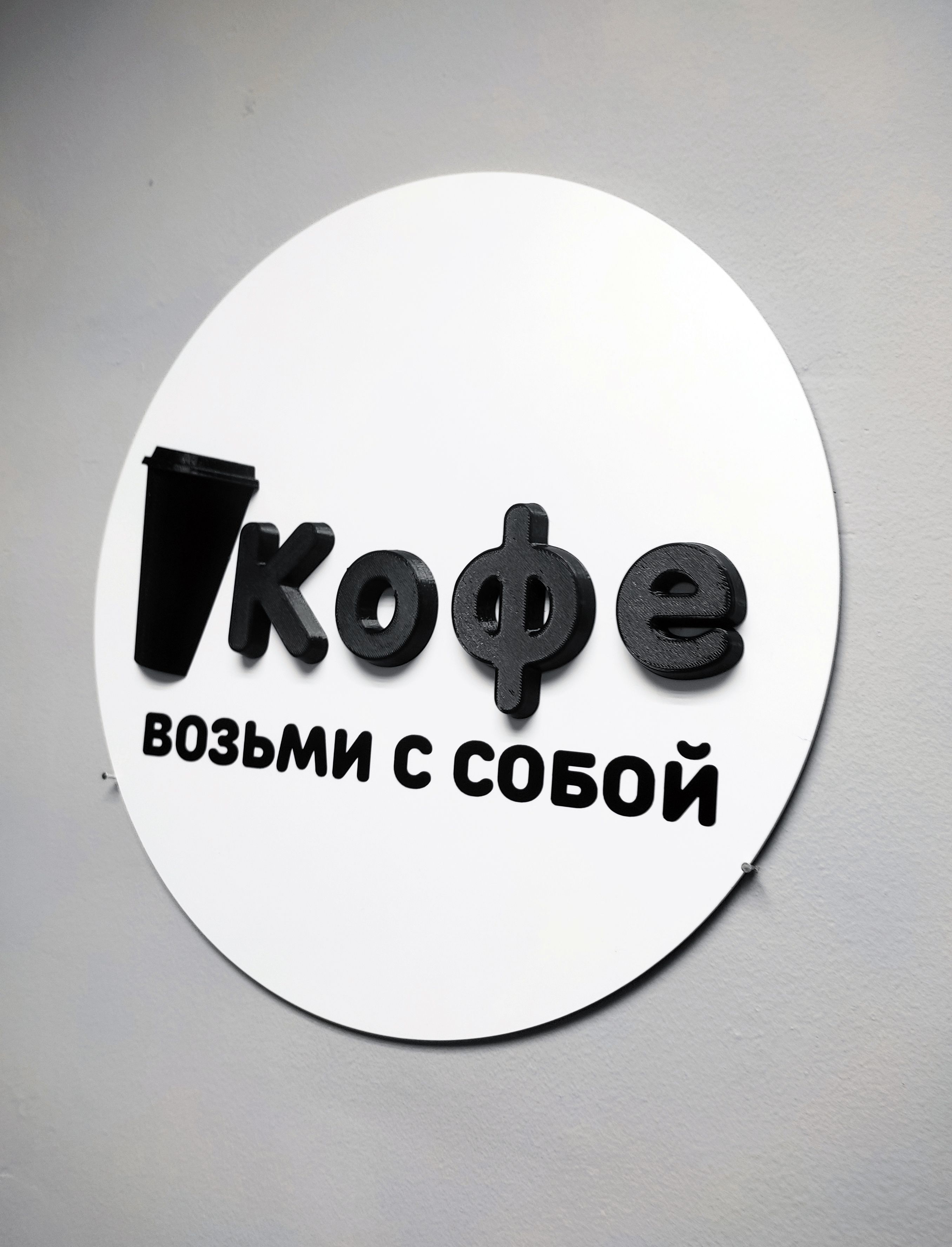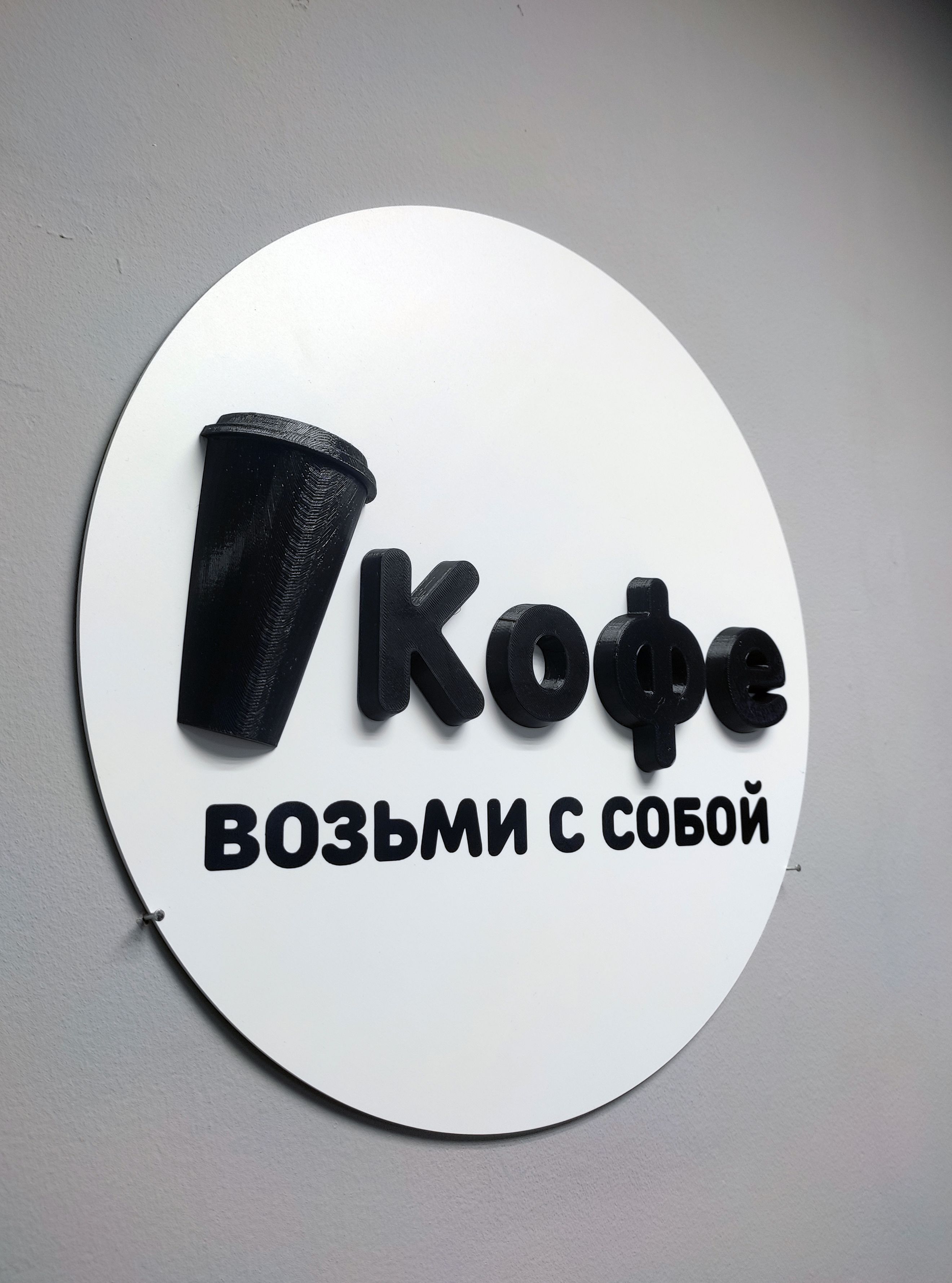 Представляем вашему вниманию уникальную и стильную 3D вывеску "кофе с собой"! Эта круглая несветовая вывеска станет настоящим украшением вашего бизнеса и привлечет внимание клиентов.