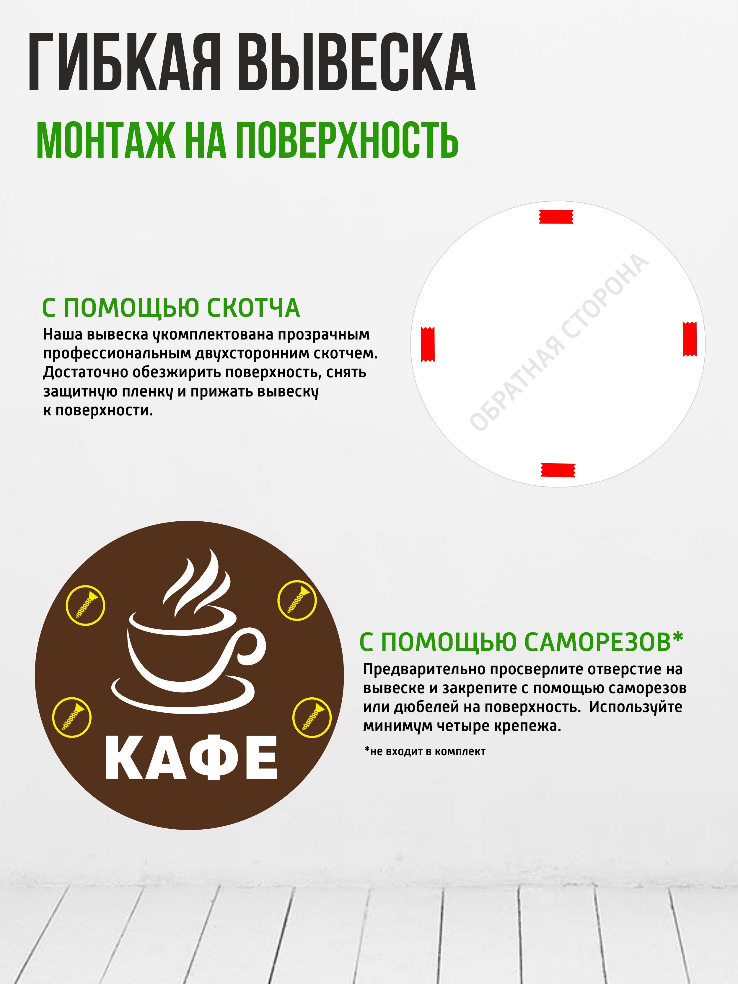 Гибкие несветовые вывески и указатели созданы из прочного полипропилена, а изображение наносится методом аппликации цветной виниловой пленки.