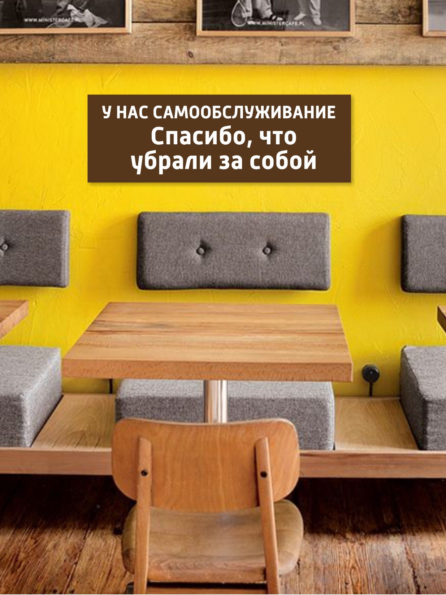 Главная / Каталог продукции / Таблички и декор / Пластиковая табличка "У нас самообслуживание, спасибо, что убрали за собой" из ПВХ толщиной 3мм