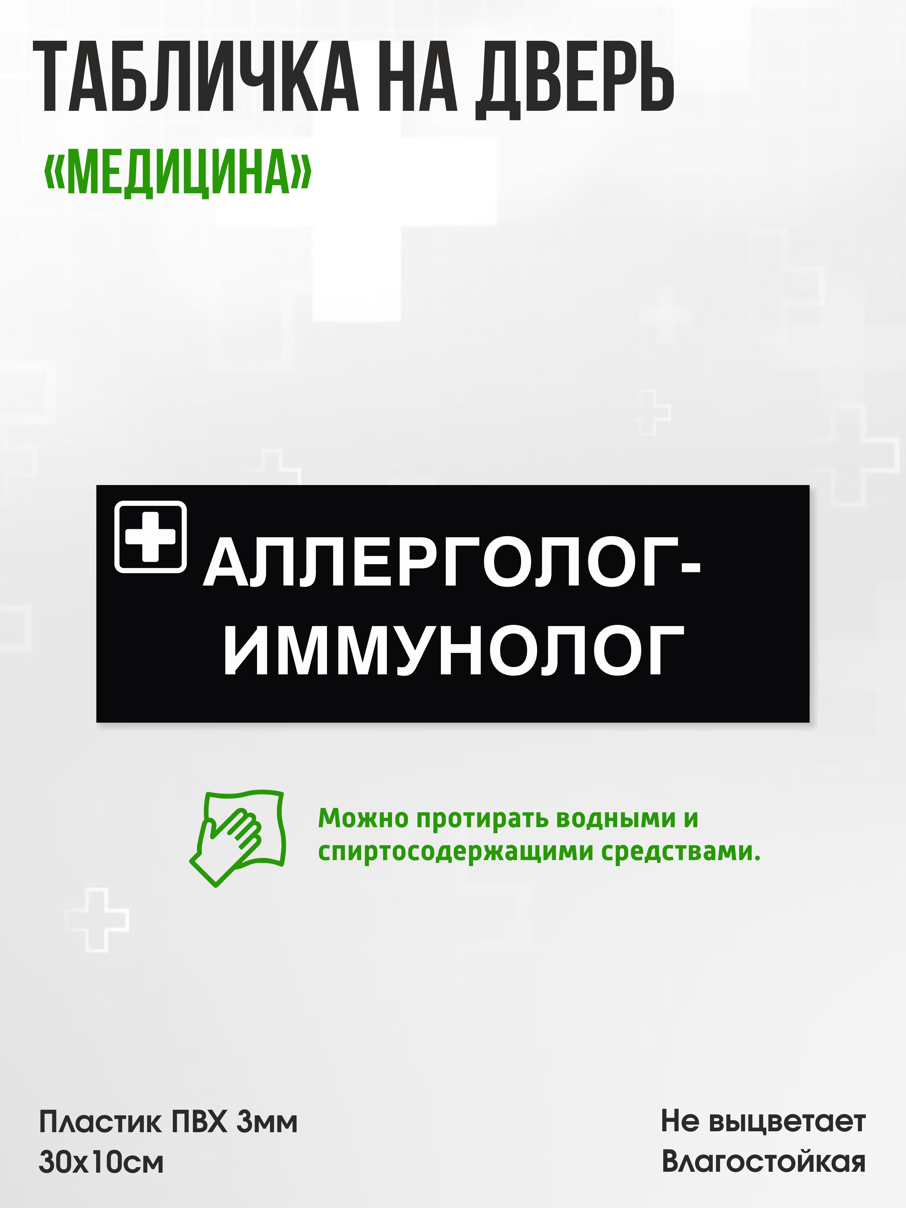 Главная / Каталог продукции / Таблички и декор / Табличка Аллерголог-иммунолог, черная, 30х10см, ПВХ пластик, на дверь, для медицинской клиники или больницы