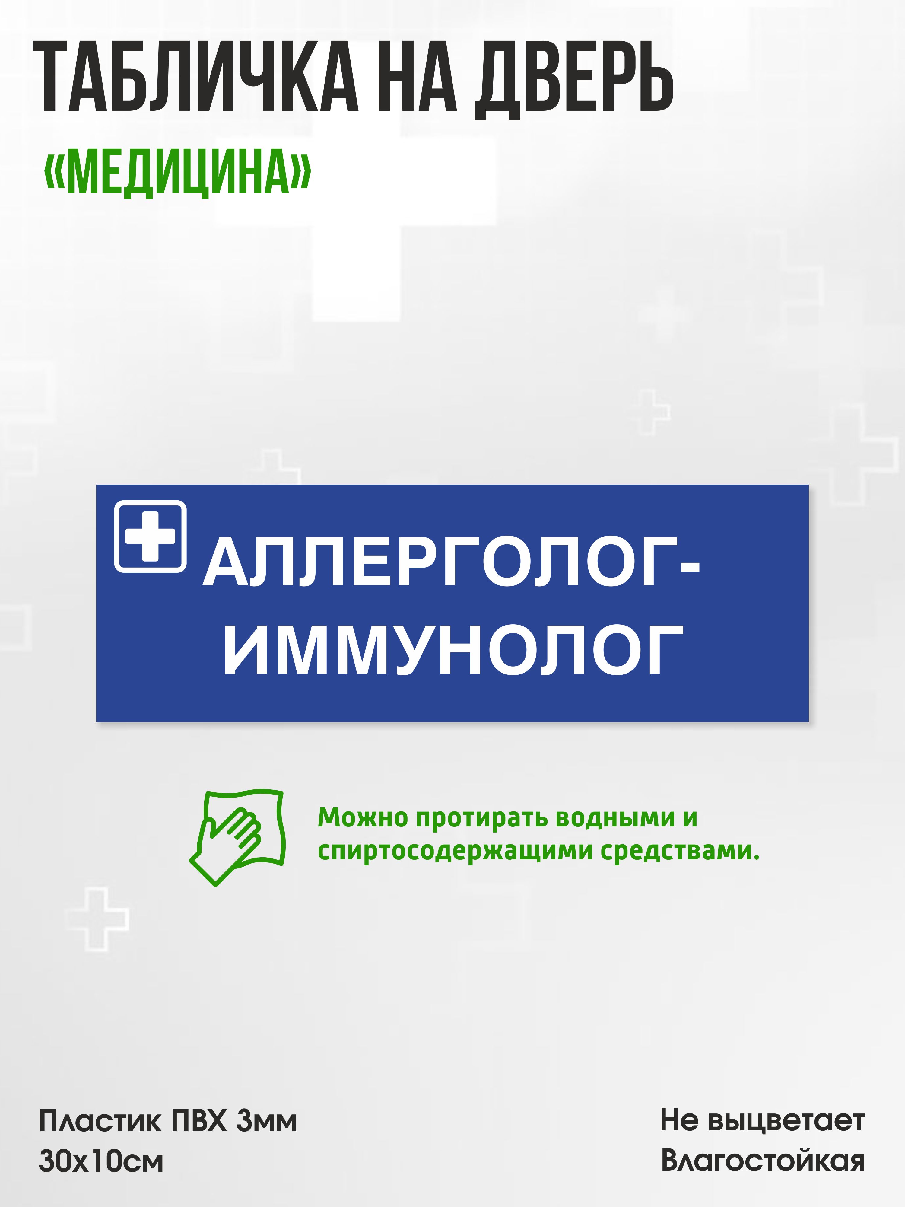 Главная / Каталог продукции / Таблички и декор / Табличка Аллерголог-иммунолог, синяя, 30х10см, ПВХ пластик, на дверь, для медицинской клиники или больницы