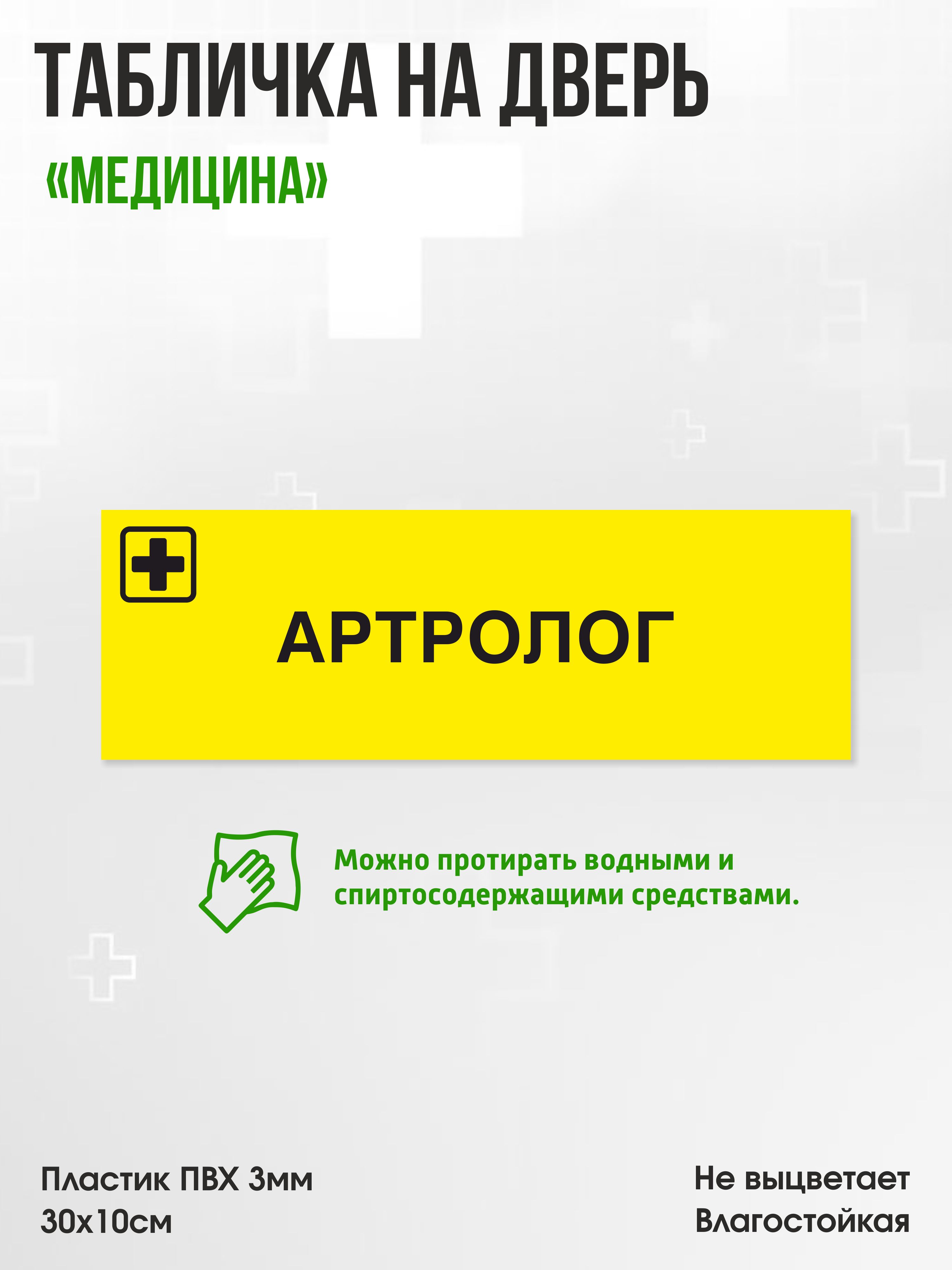 Табличка Артролог, жёлтая, 30х10см, ПВХ пластик, на дверь, для медицинской клиники или больницы