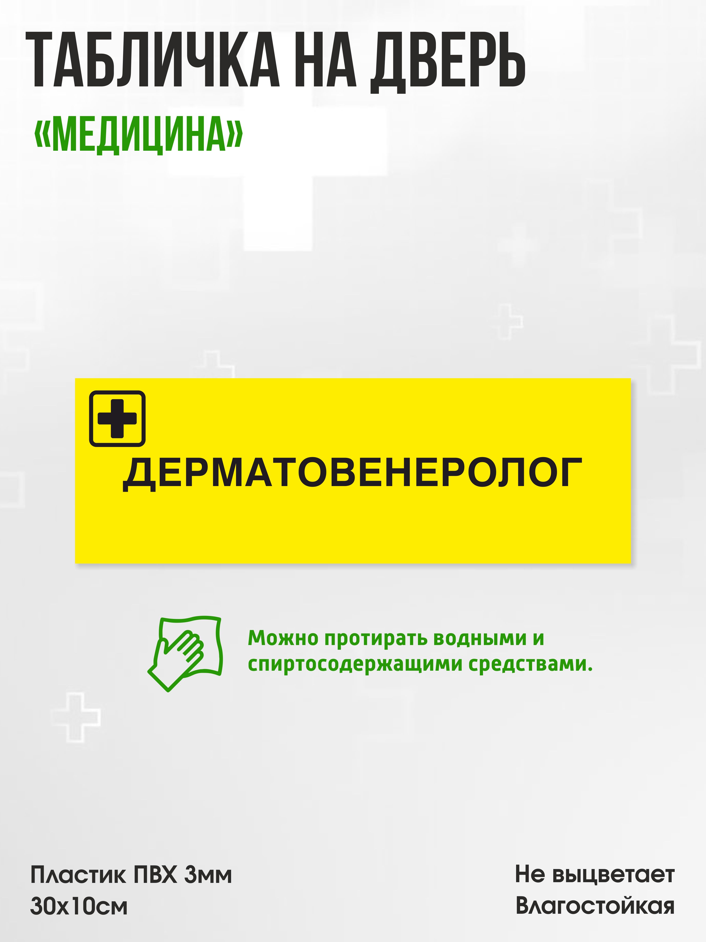 Табличка Дерматовенеролог, жёлтая, 30х10см, ПВХ пластик, на дверь, для медицинской клиники или больницы