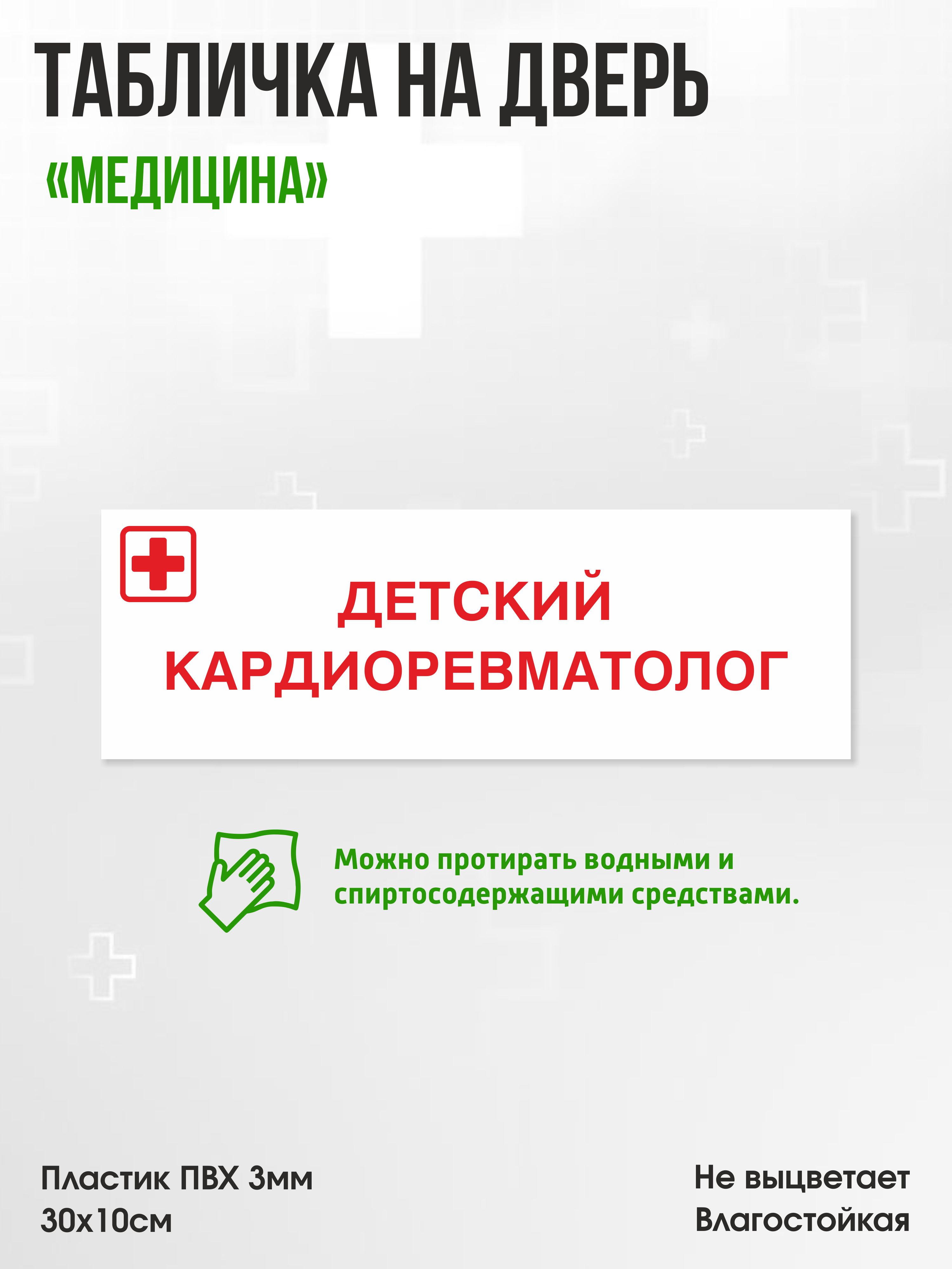 Табличка Детский кардиоревматолог, белая, 30х10см, ПВХ пластик, на дверь, для медицинской клиники или больницы