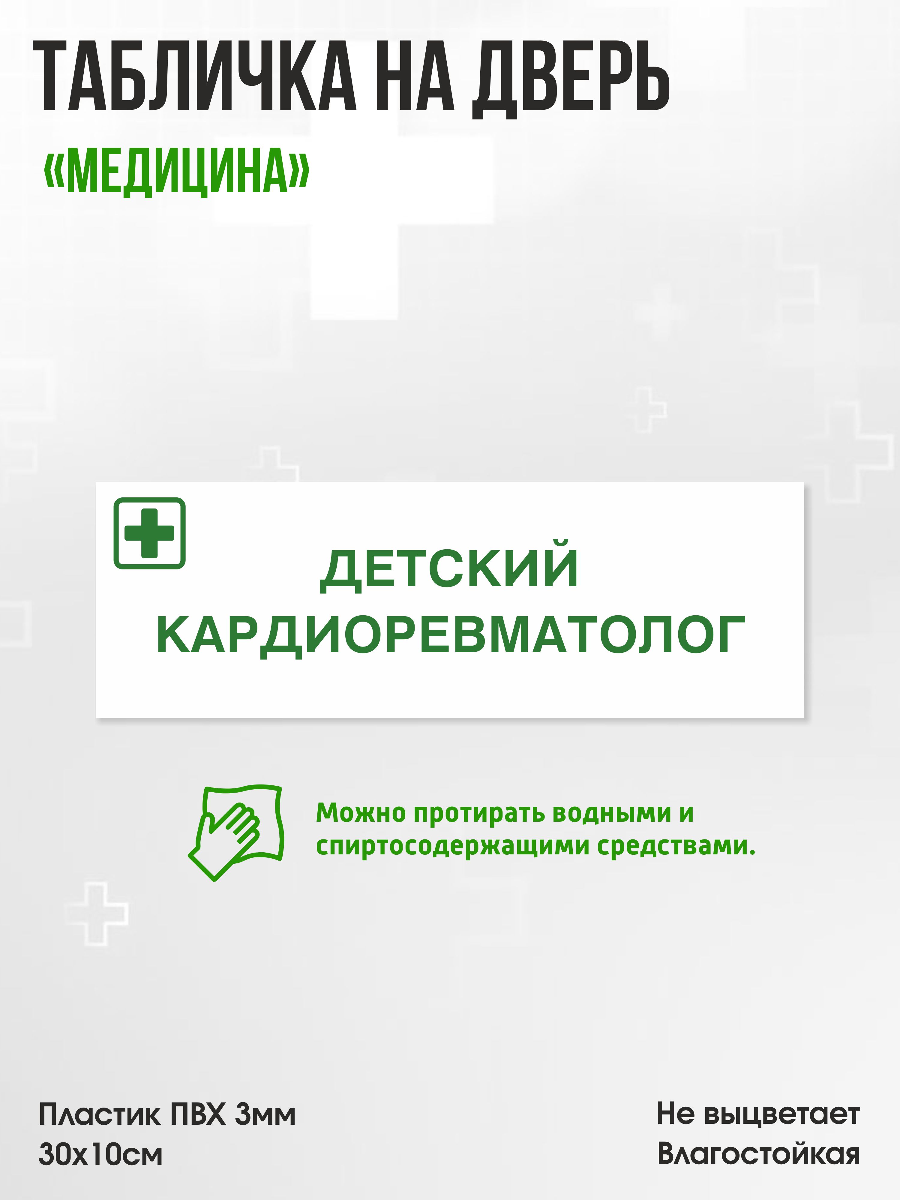 Табличка Детский кардиоревматолог, белая, 30х10см, ПВХ пластик, на дверь, для медицинской клиники или больницы