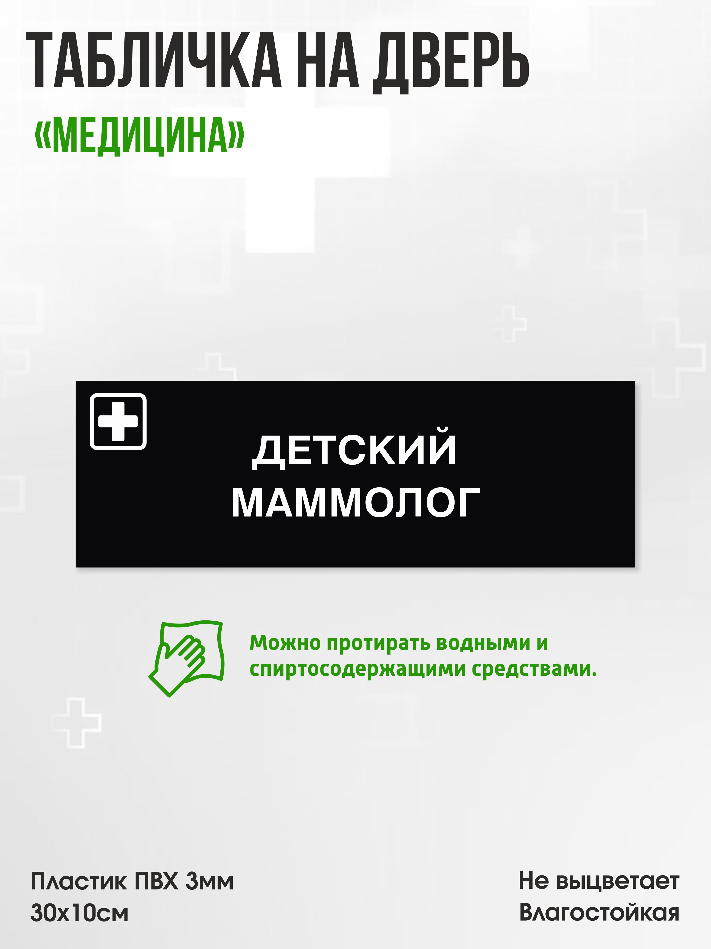 Табличка Детский маммолог, черная, 30х10см, ПВХ пластик, на дверь, для медицинской клиники или больницы