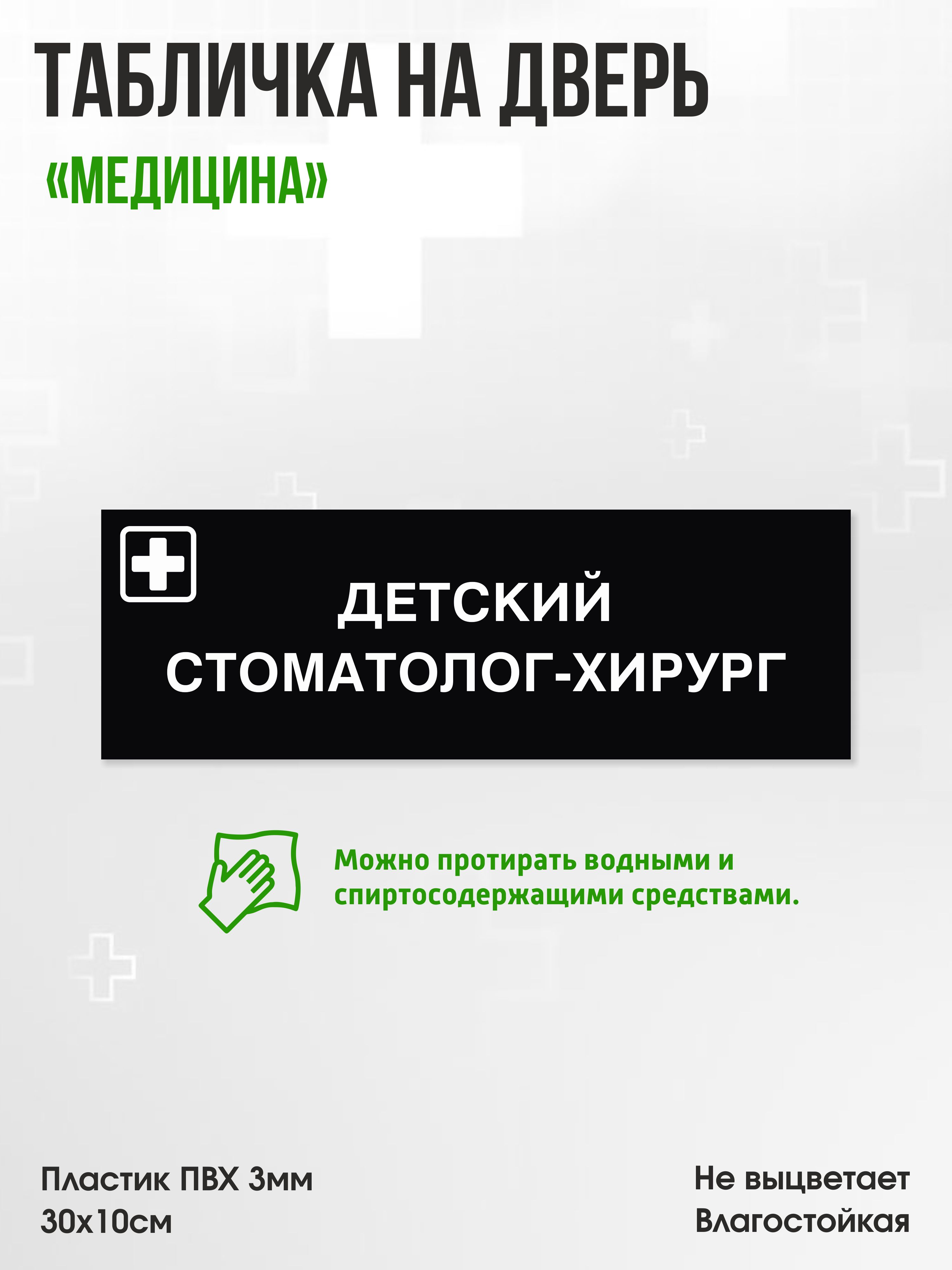Главная / Каталог продукции / Таблички и декор / Табличка Детский стоматолог-хирург, черная, 30х10см, ПВХ пластик, на дверь, для медицинской клиники или больницы