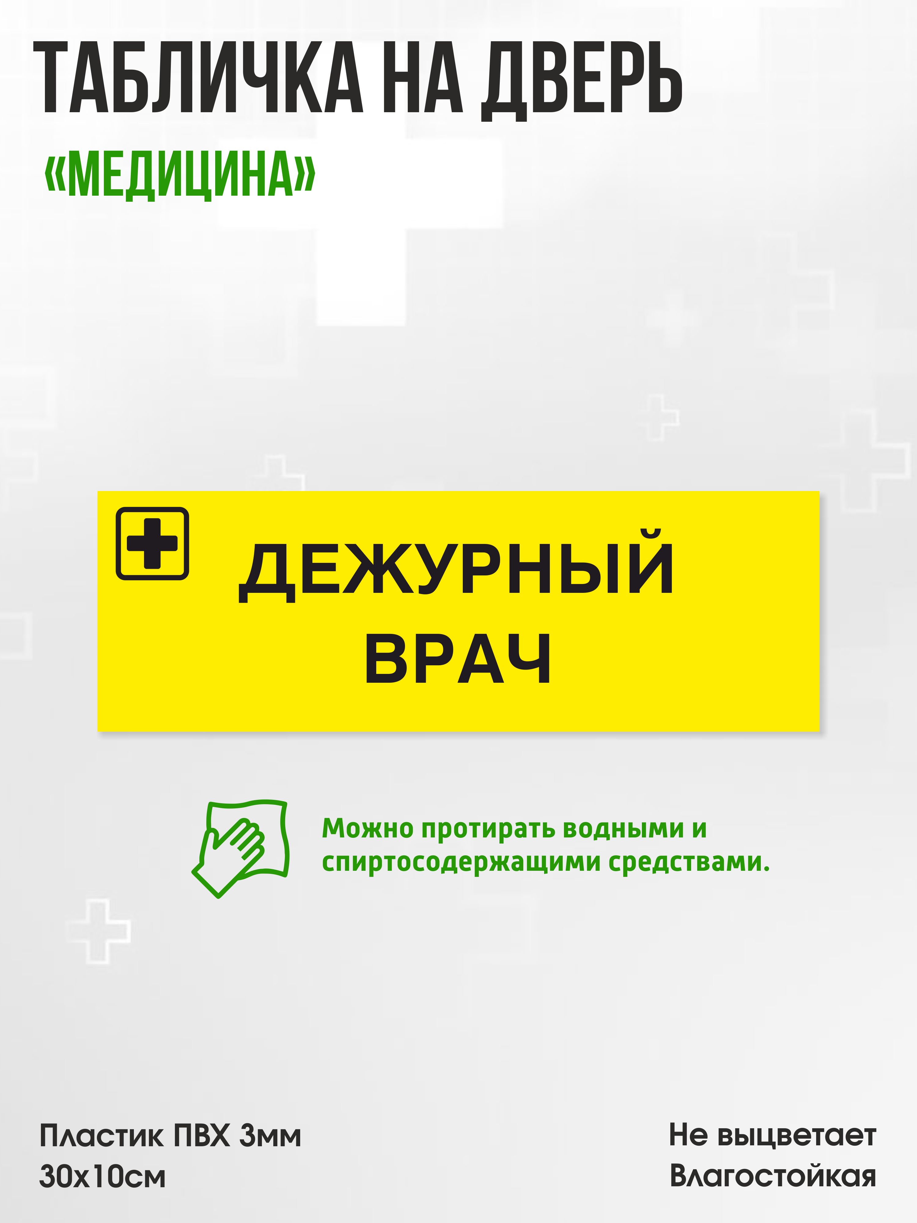Табличка Дежурный врач, жёлтая, 30х10см, ПВХ пластик, на дверь, для медицинской клиники или больницы