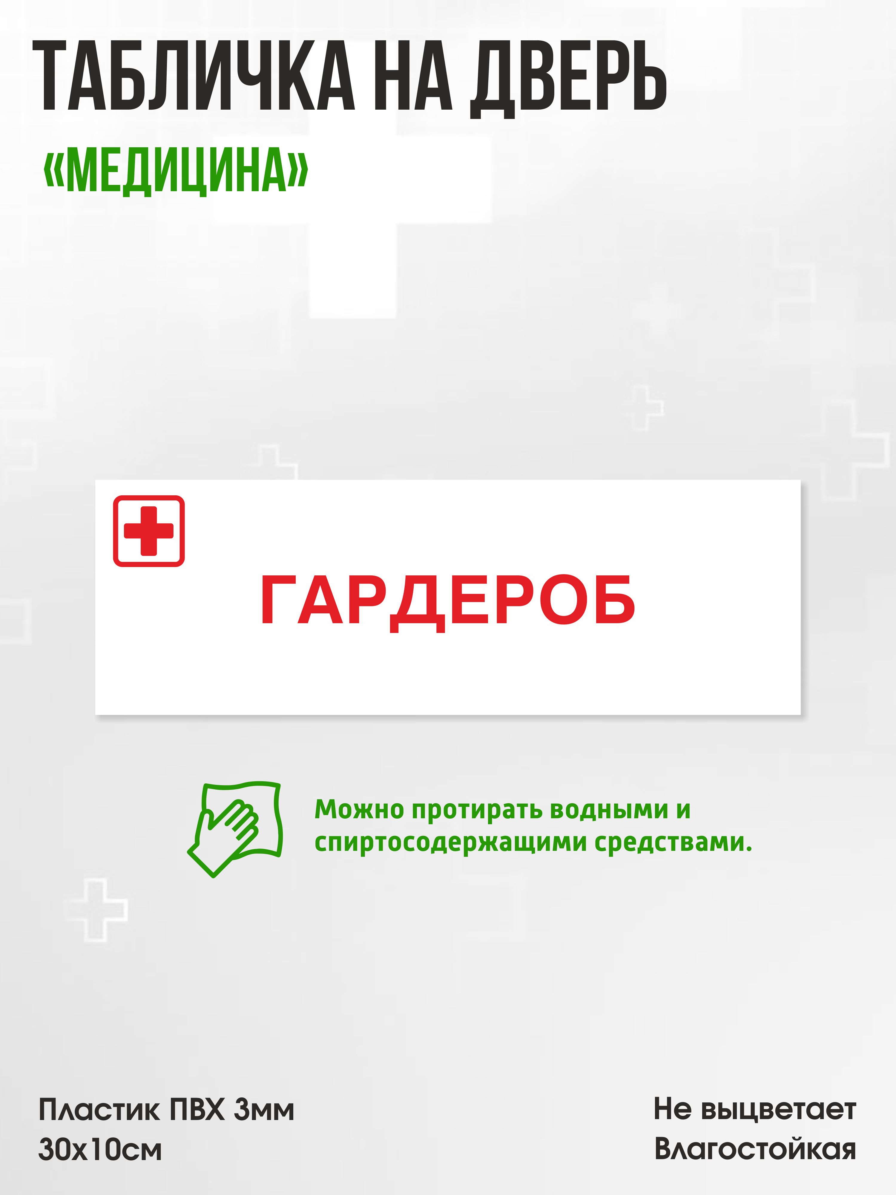Табличка Гардероб, белая, 30х10см, ПВХ пластик, на дверь, для медицинской клиники или больницы