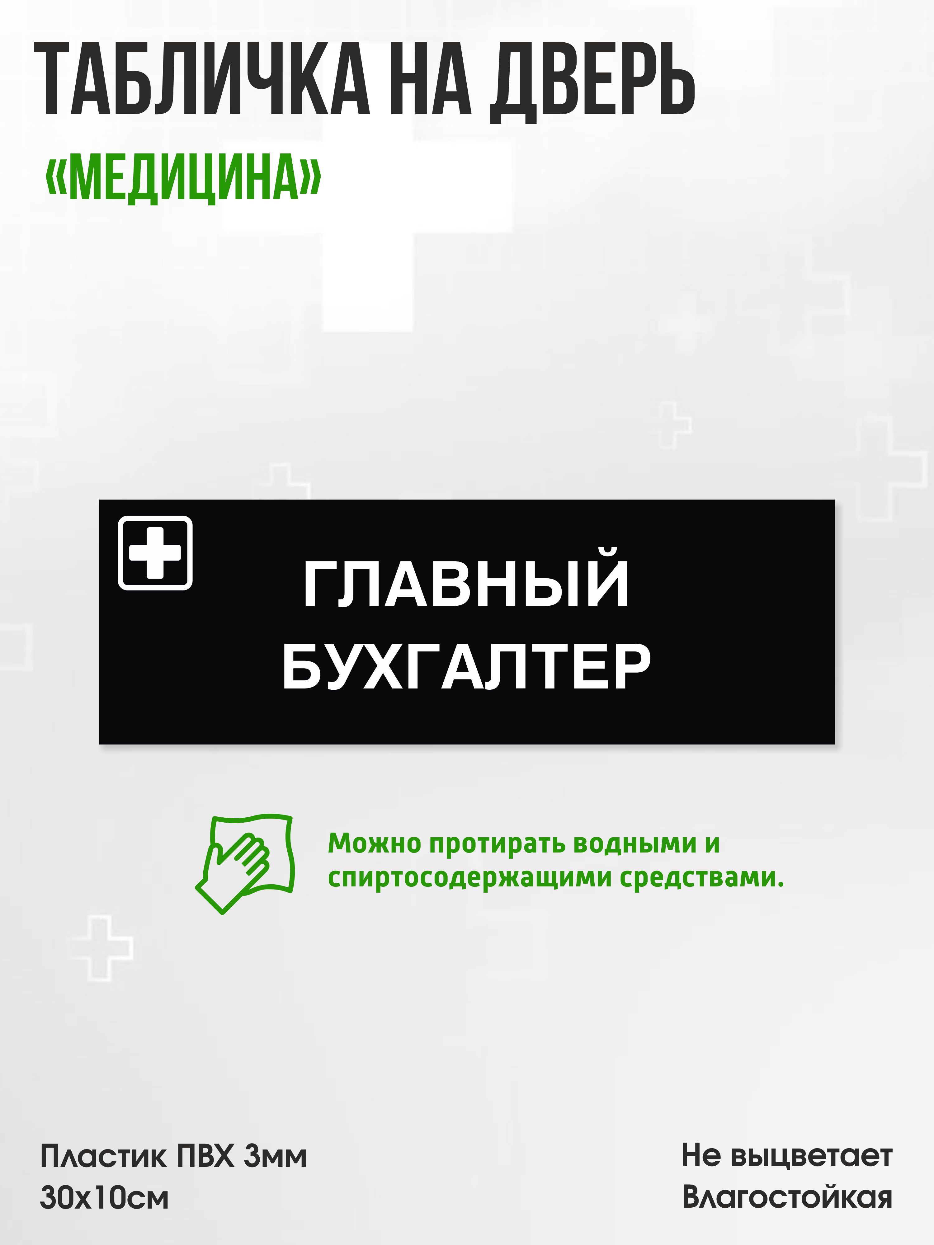 Главная / Каталог продукции / Таблички и декор / Табличка Главный бухгалтер, черная, 30х10см, ПВХ пластик, на дверь, для медицинской клиники или больницы