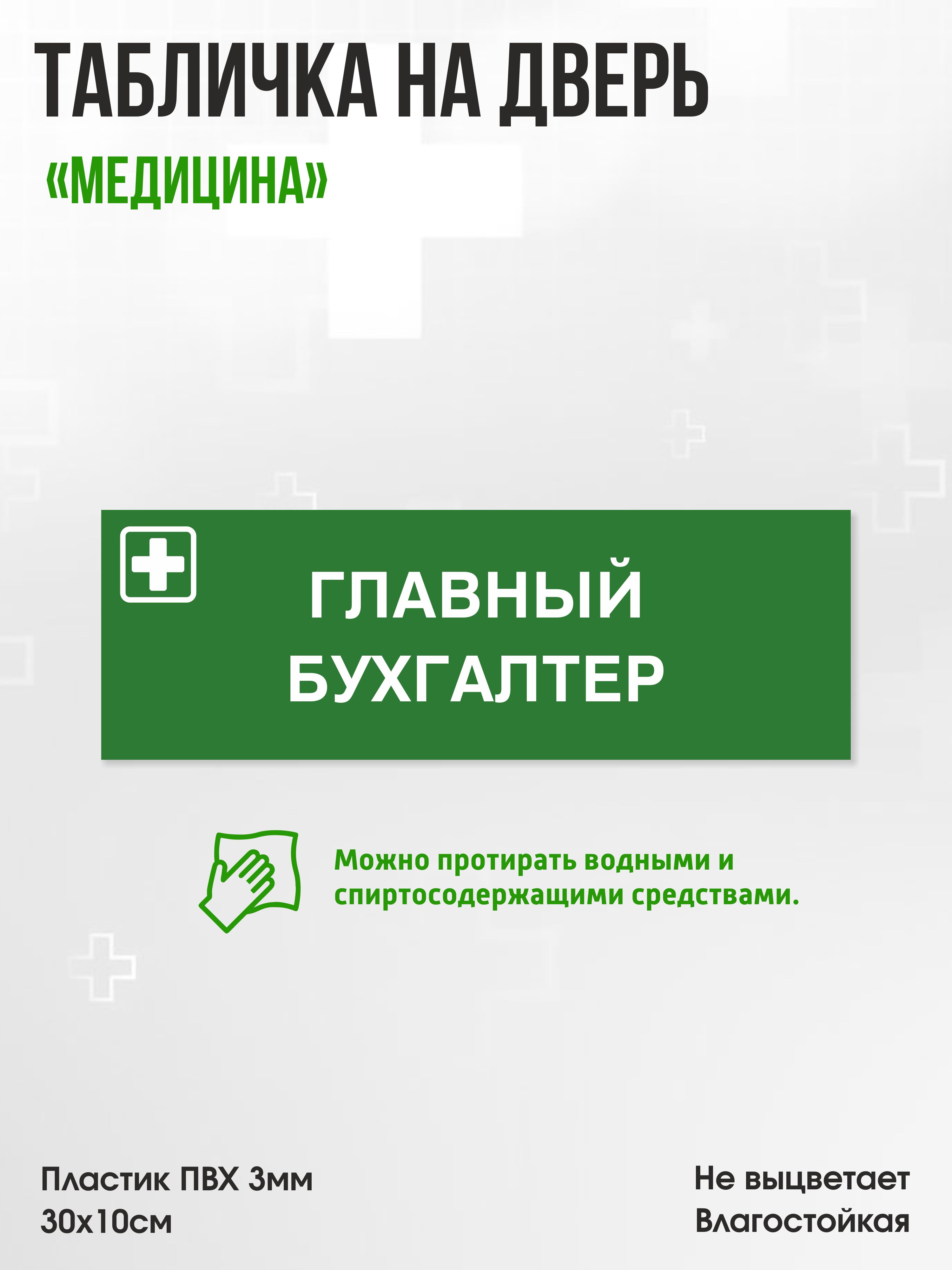 Главная / Каталог продукции / Таблички и декор / Табличка Главный бухгалтер, зеленая, 30х10см, ПВХ пластик, на дверь, для медицинской клиники или больницы