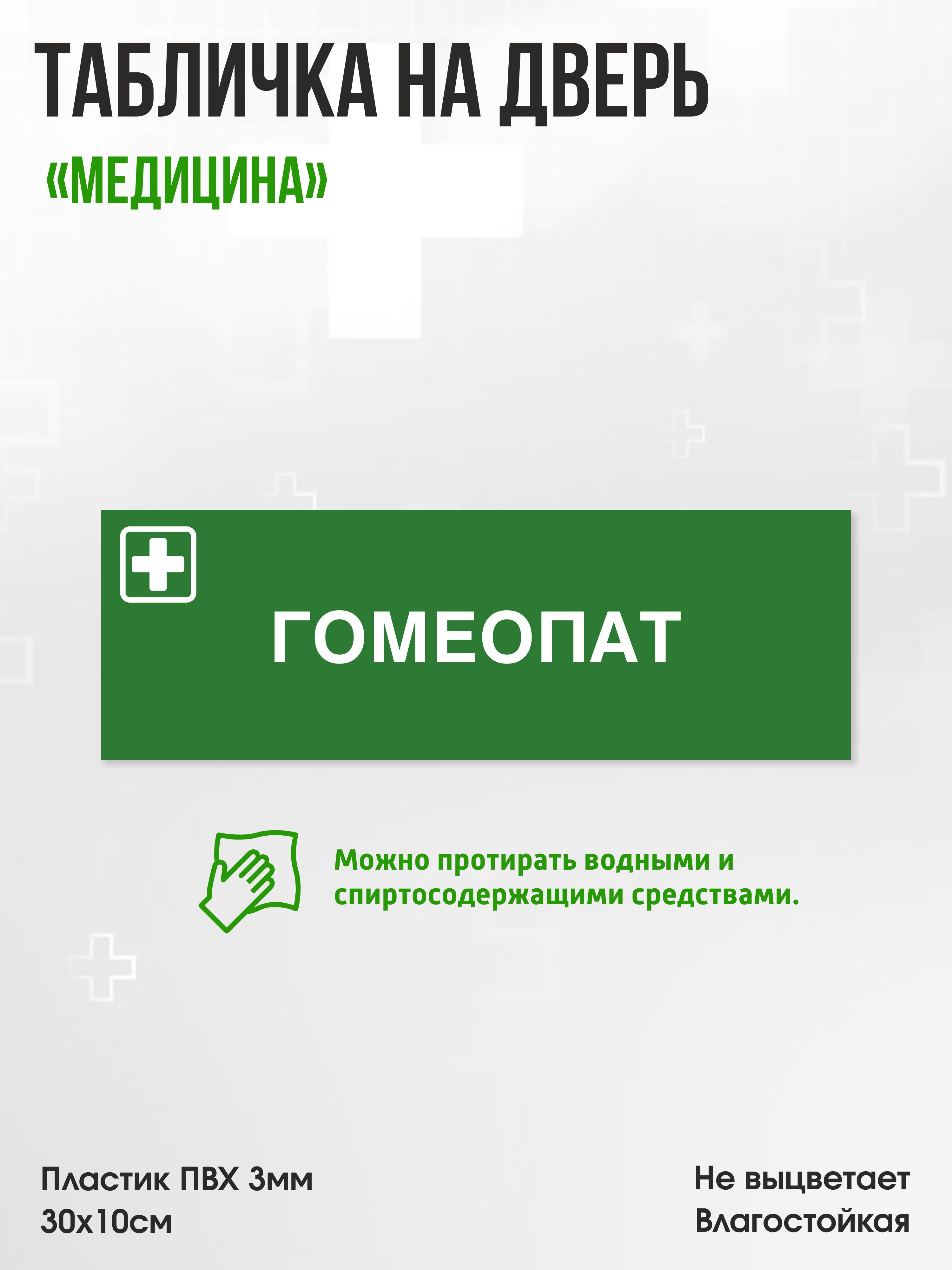 Табличка Гомеопат, зеленая, 30х10см, ПВХ пластик, на дверь, для медицинской клиники или больницы