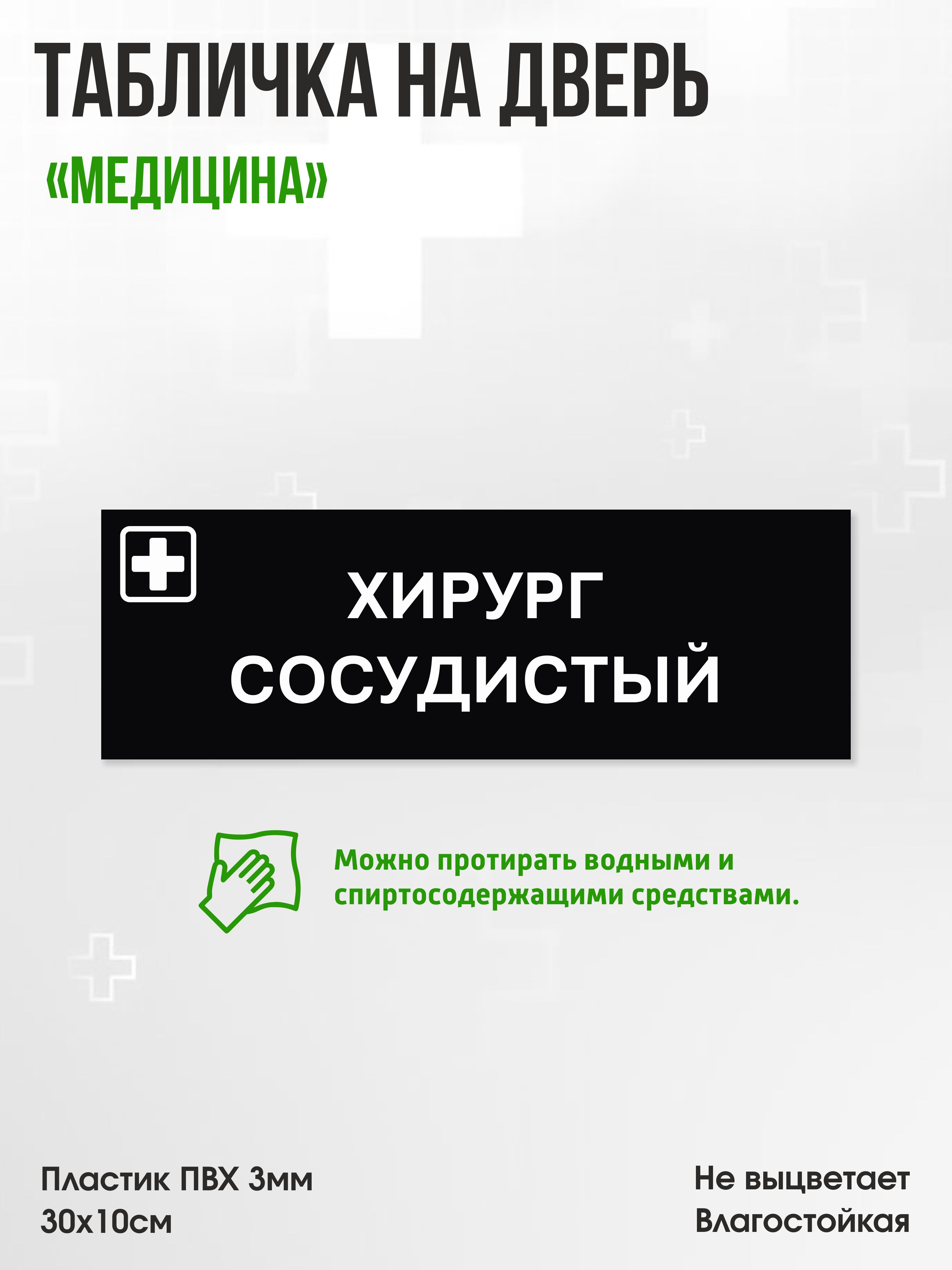 Табличка Хирург сосудистый, черная, 30х10см, ПВХ пластик, на дверь, для медицинской клиники или больницы