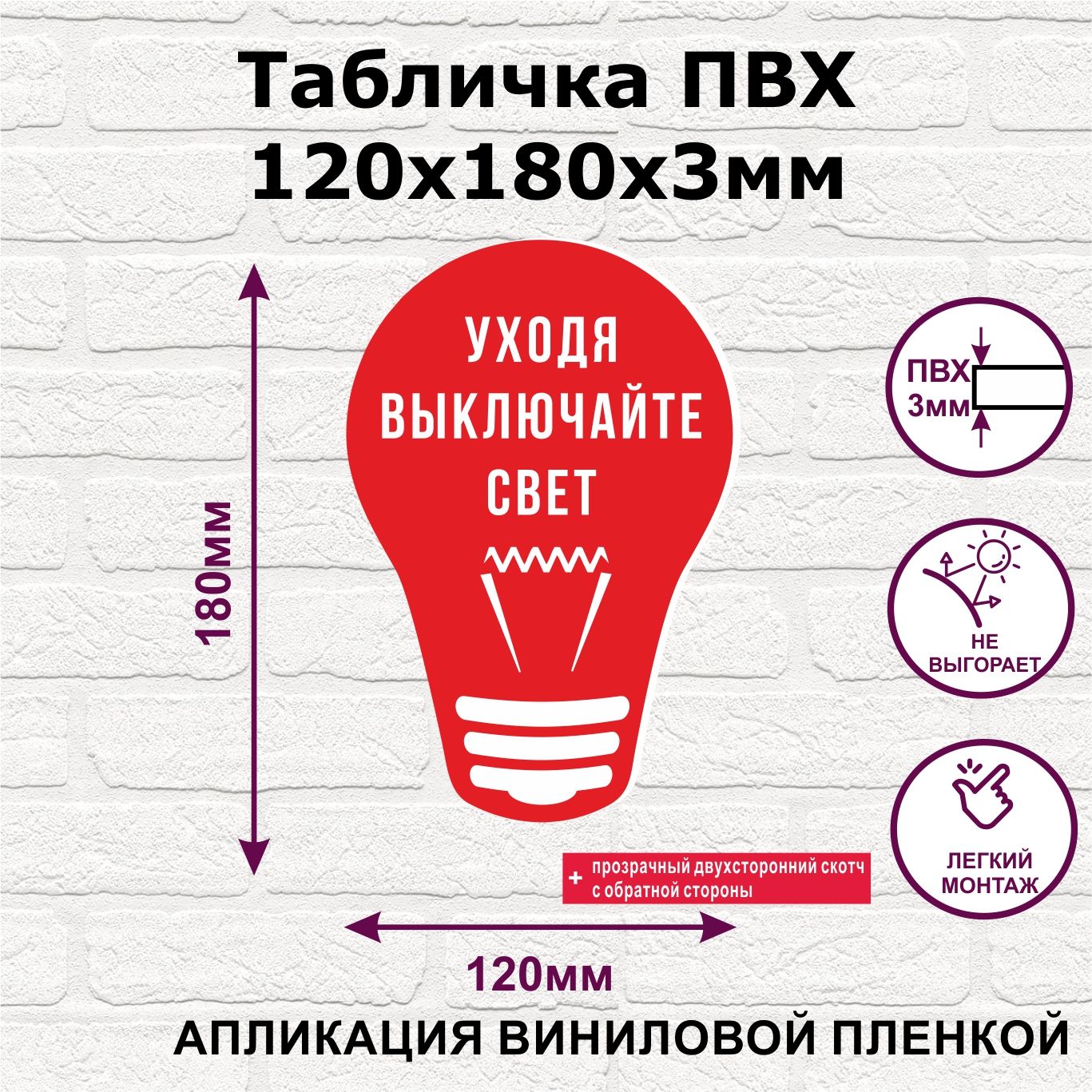 Информационная табличка изготовлена из пвх 3 мм методом аппликации виниловой влагостойкой пленки, крепление на двухсторонний скотч (в комплекте). Табличка не выгорает устойчива к влаге. При необходимости можно мыть от легких загрязнений влажной тряпкой. Табличку также можно закрепить на саморезы предварительно просверлив отверстия не менее чем 5мм от края таблички.