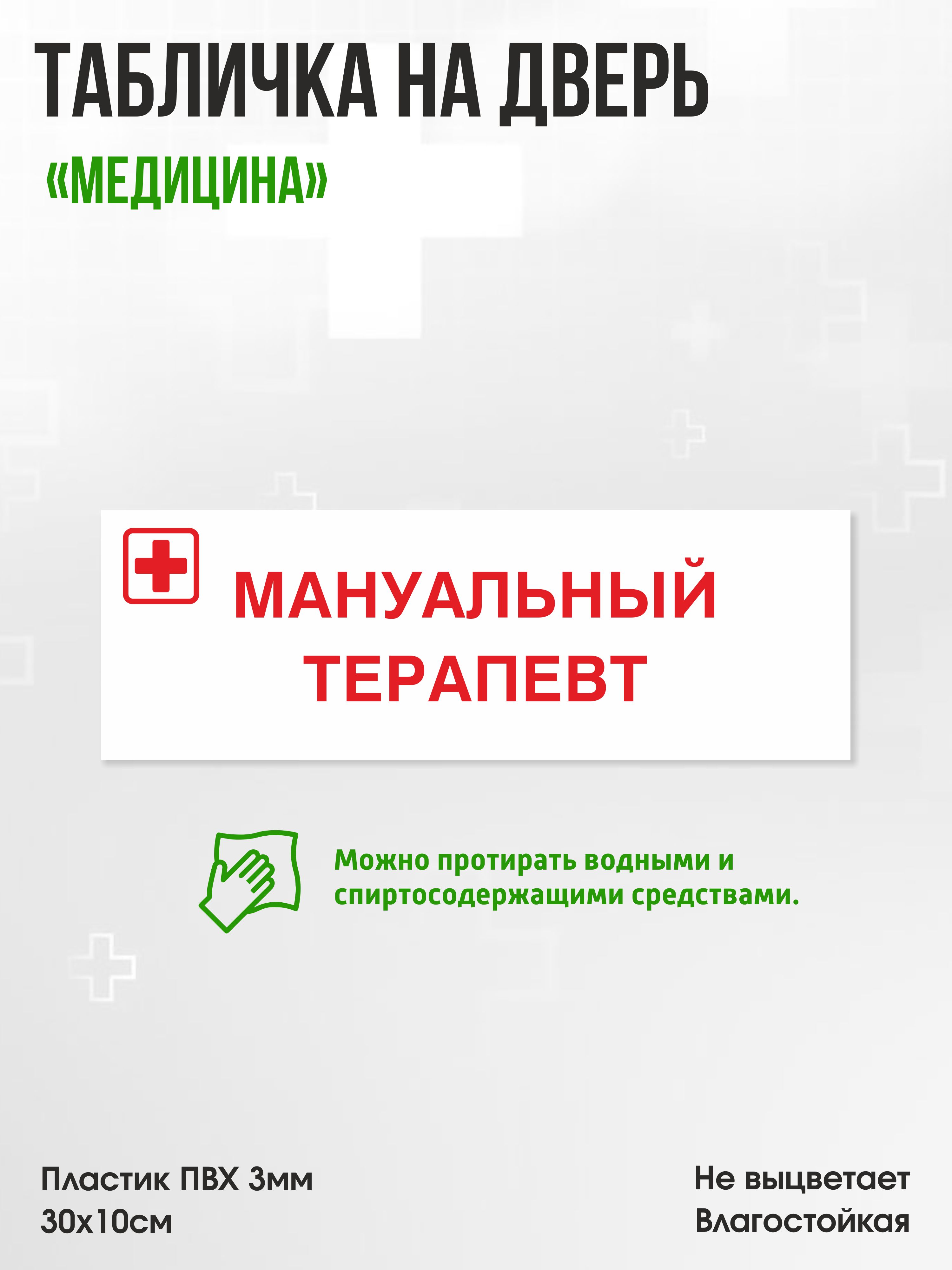 Табличка Мануальный терапевт, белая, 30х10см, ПВХ пластик, на дверь, для медицинской клиники или больницы