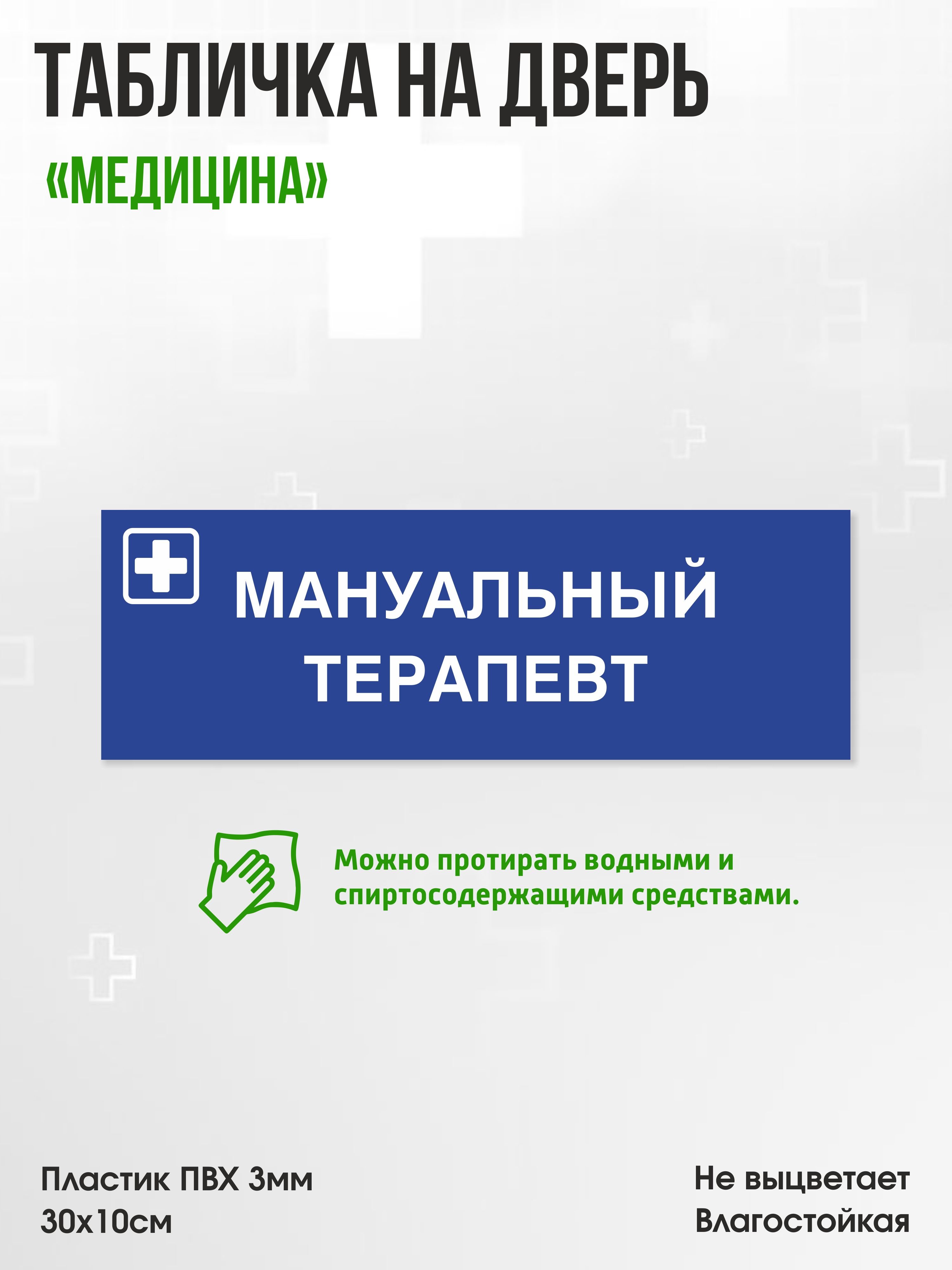 Табличка Мануальный терапевт, синяя, 30х10см, ПВХ пластик, на дверь, для медицинской клиники или больницы