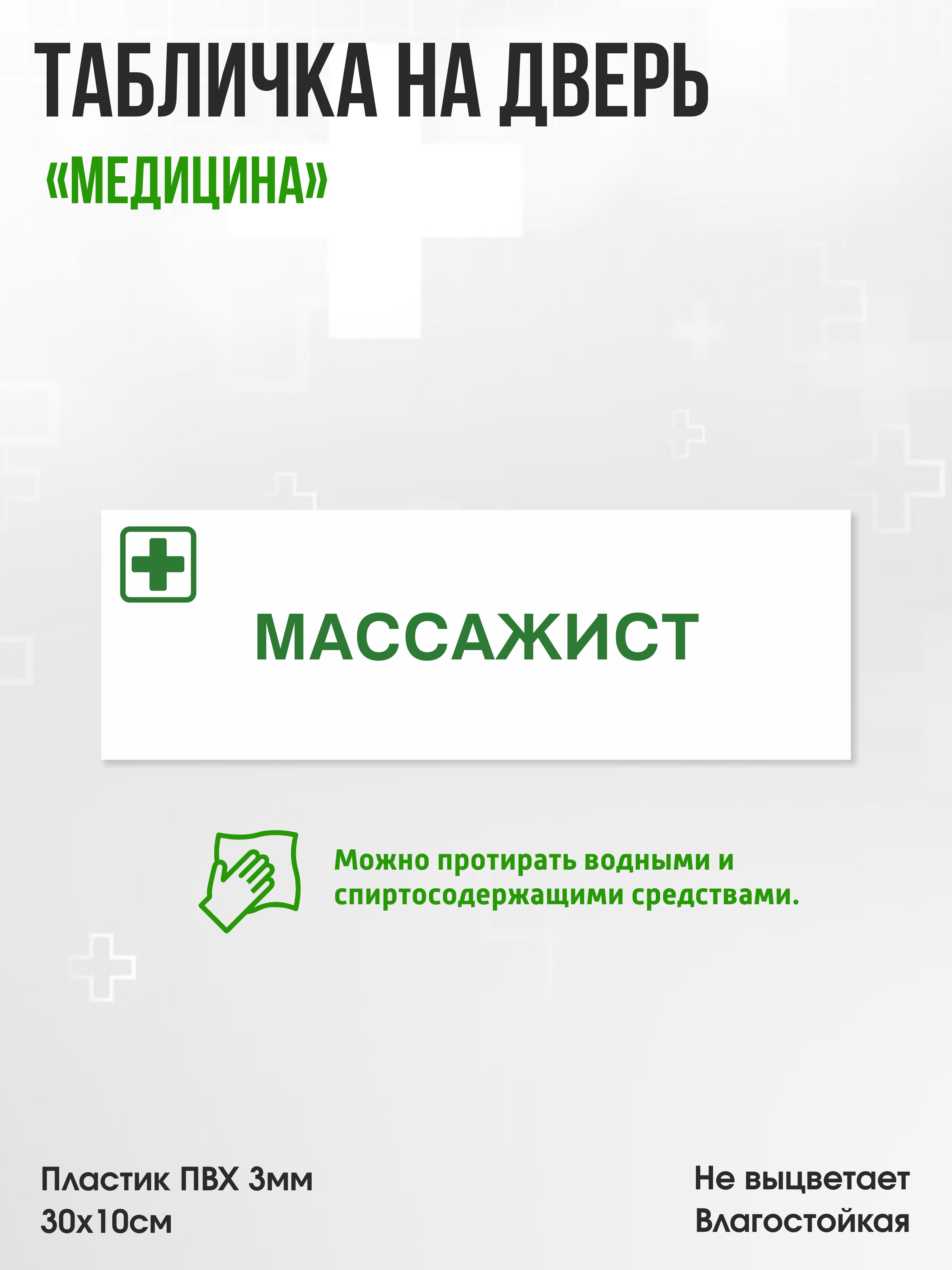 Табличка Массажист, белая, 30х10см, ПВХ пластик, на дверь, для медицинской клиники или больницы