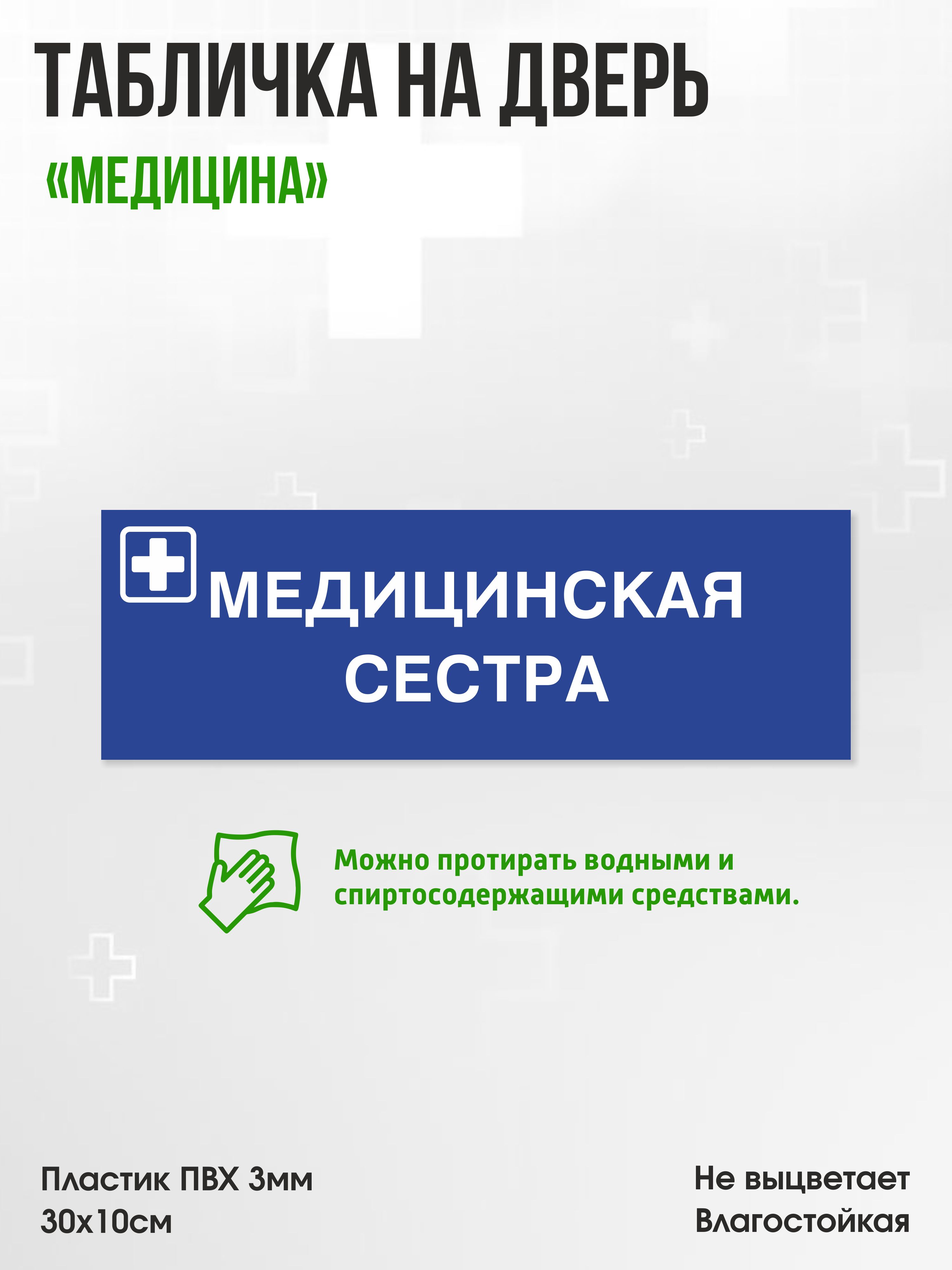 Главная / Каталог продукции / Таблички и декор / Табличка Медицинская сестра, синяя, 30х10см, ПВХ пластик, на дверь, для медицинской клиники или больницы