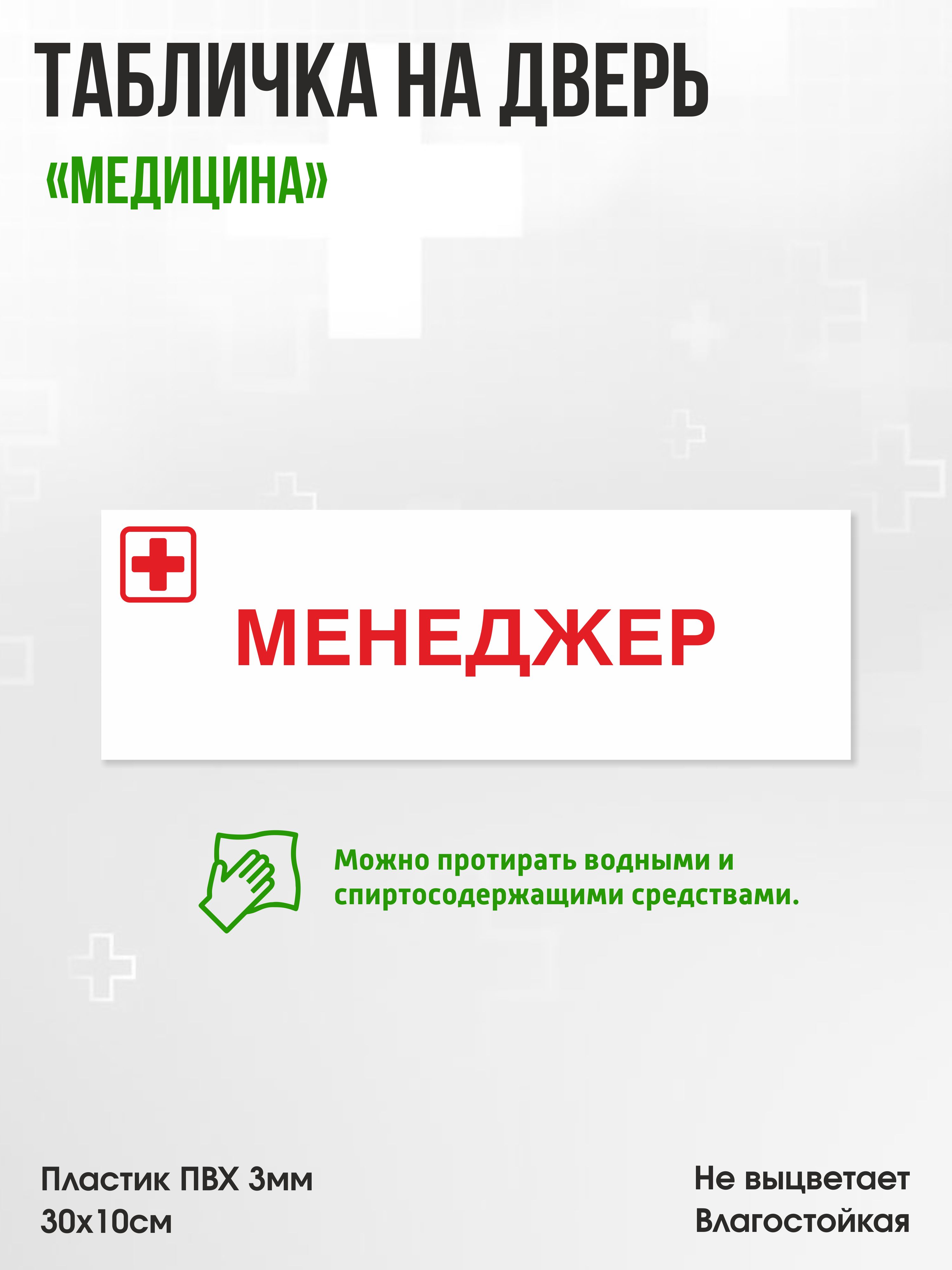 Табличка Менеджер, белая, 30х10см, ПВХ пластик, на дверь, для медицинской клиники или больницы