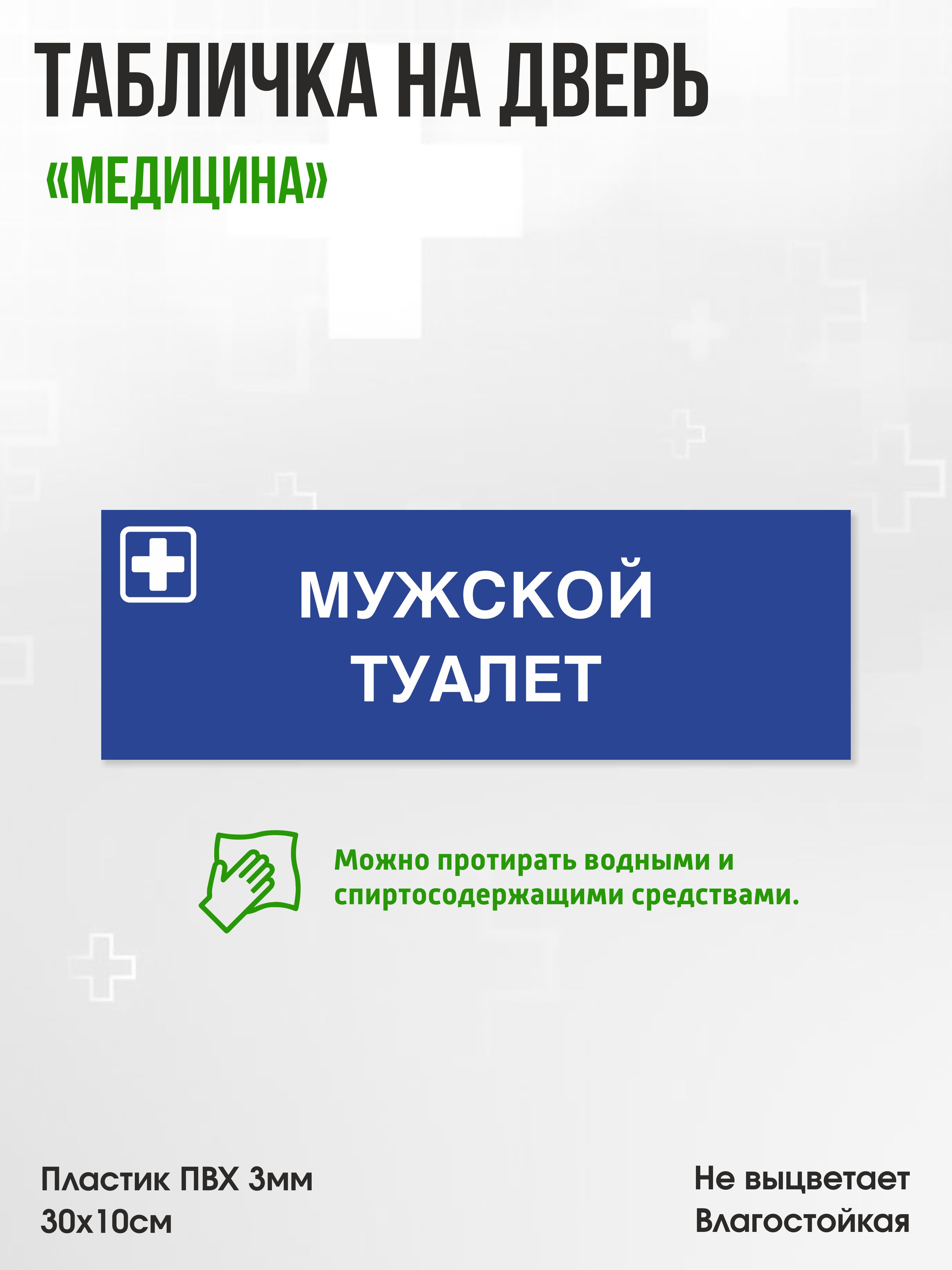 Табличка Мужской туалет, синяя, 30х10см, ПВХ пластик, на дверь, для медицинской клиники или больницы
