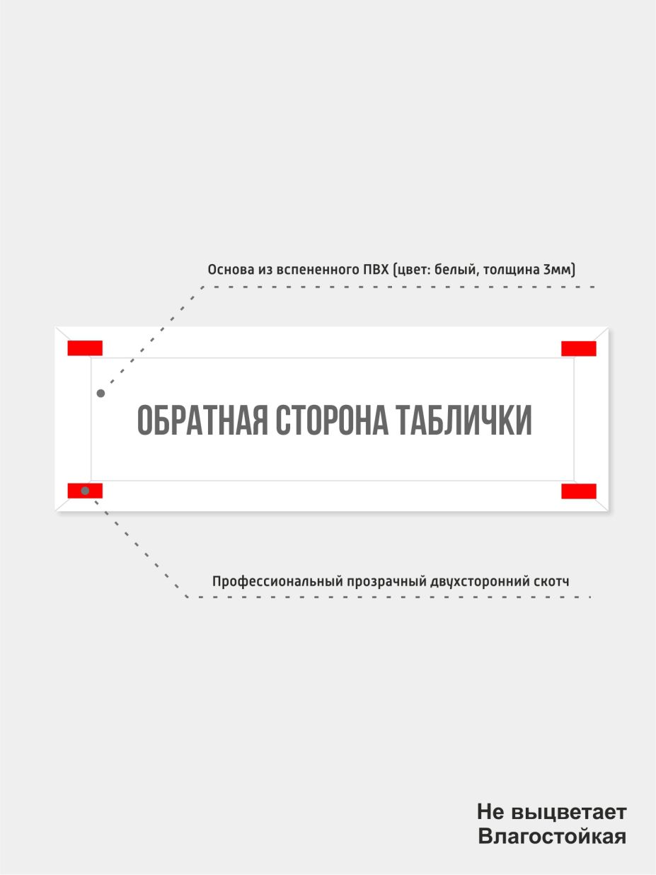 Информационная табличка изготовлена из пвх 3 мм методом аппликации виниловой влагостойкой пленки, крепление на двухсторонний скотч (в комплекте). Табличка не выгорает устойчива к влаге. При необходимости можно мыть от легких загрязнений влажной тряпкой. Табличку также можно закрепить на саморезы предварительно просверлив отверстия не менее чем 5мм от края таблички.