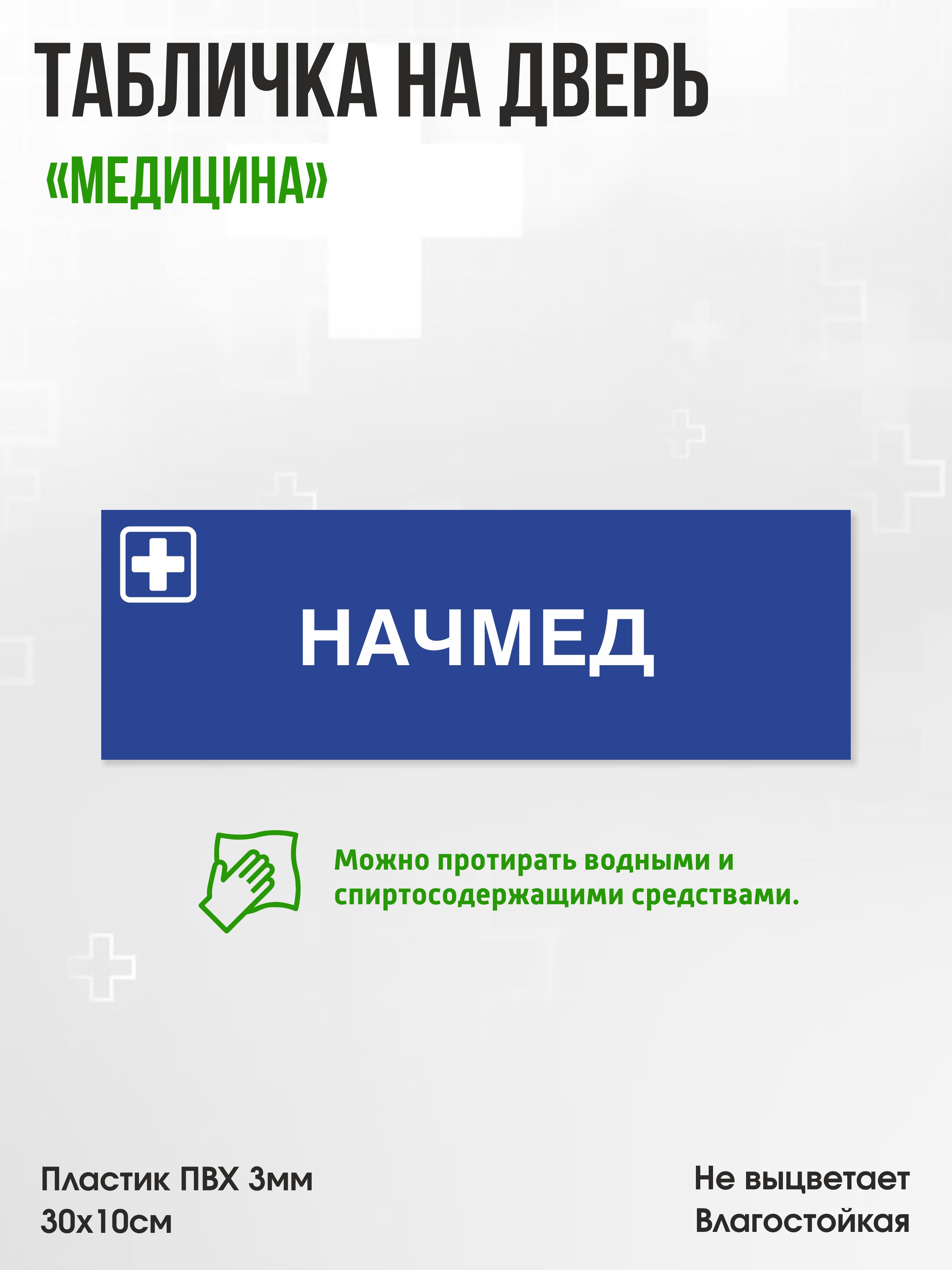 Табличка Начмед, синяя, 30х10см, ПВХ пластик, на дверь, для медицинской клиники или больницы