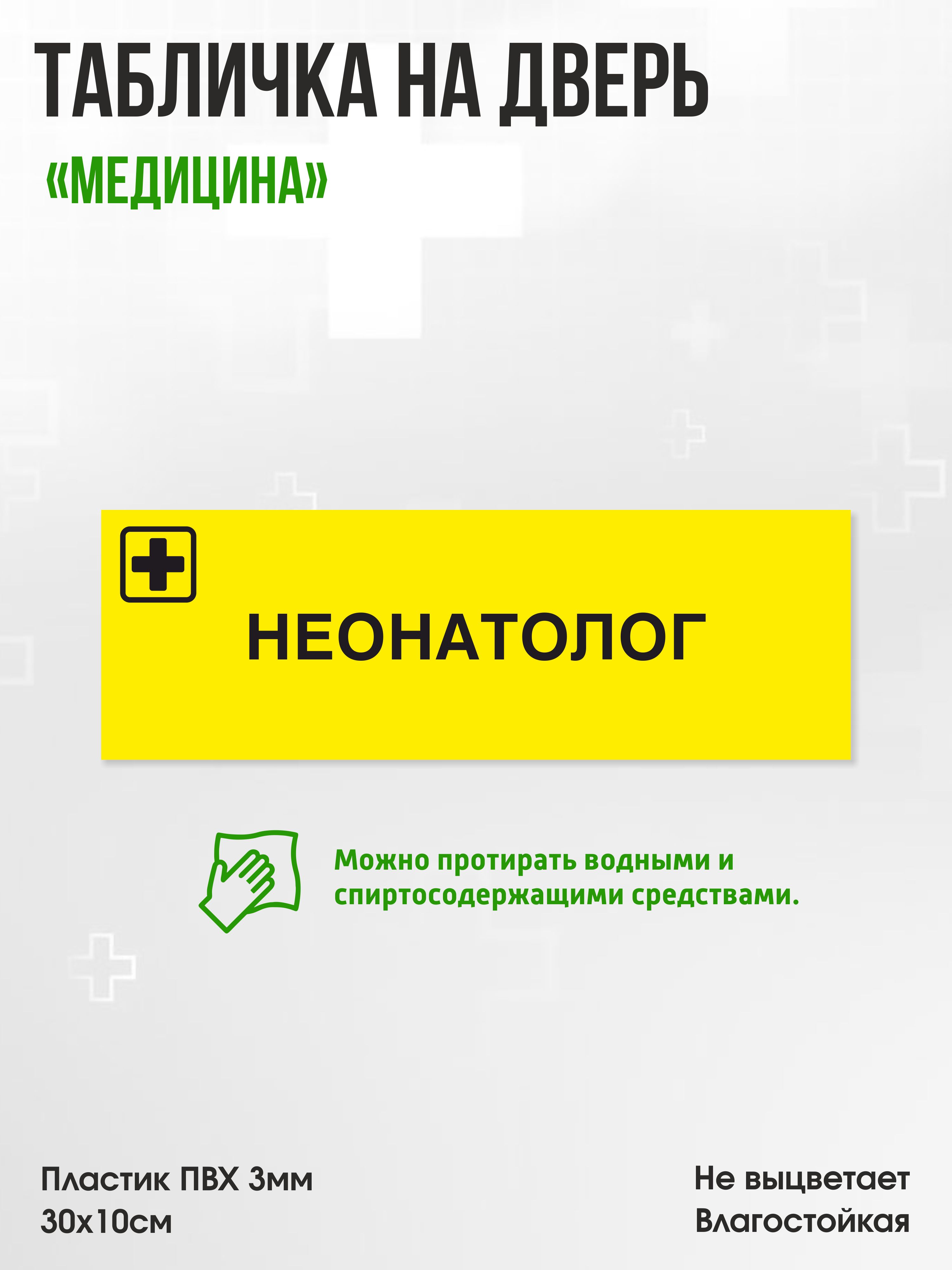 Табличка Неонатолог, жёлтая, 30х10см, ПВХ пластик, на дверь, для медицинской клиники или больницы