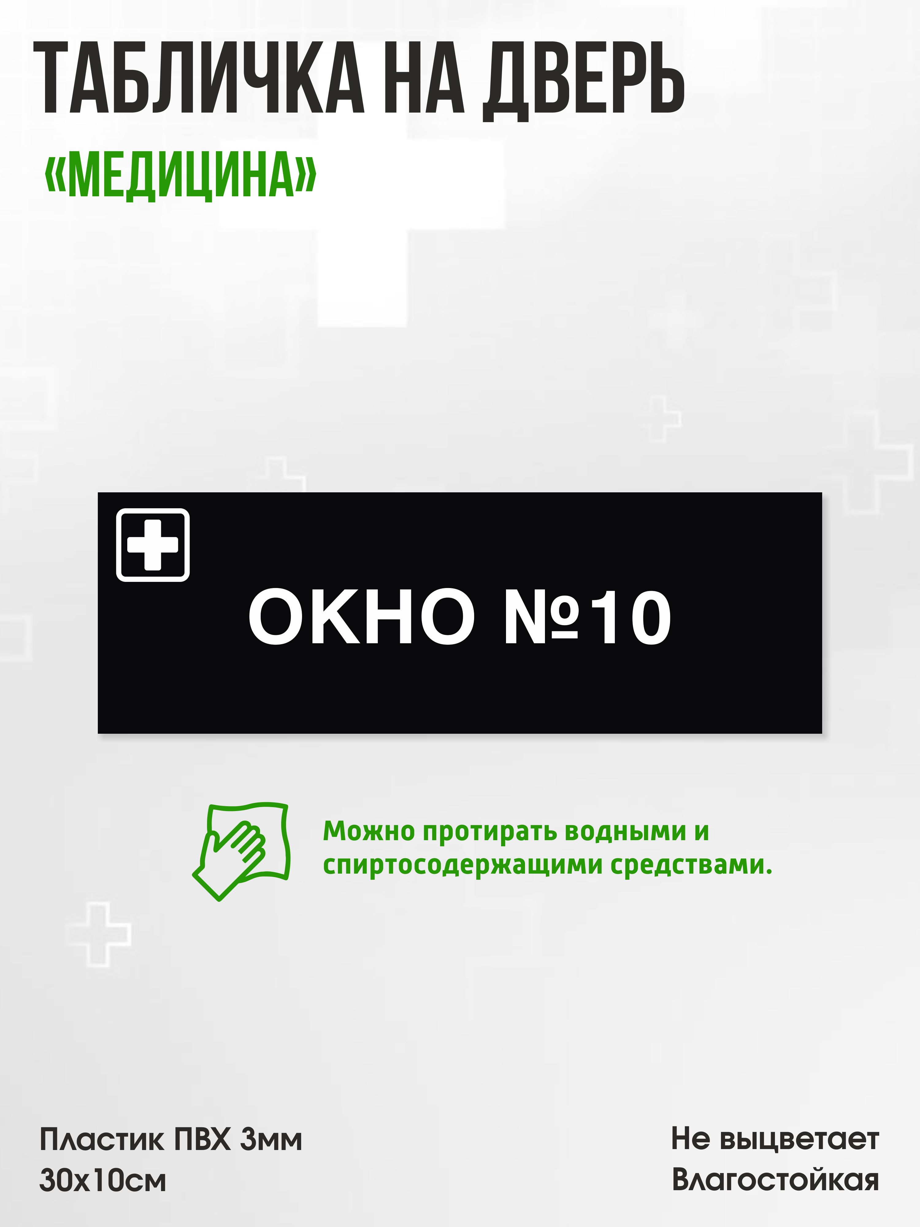 Табличка Окно №10, черная, 30х10см, ПВХ пластик, на дверь, для медицинской клиники или больницы