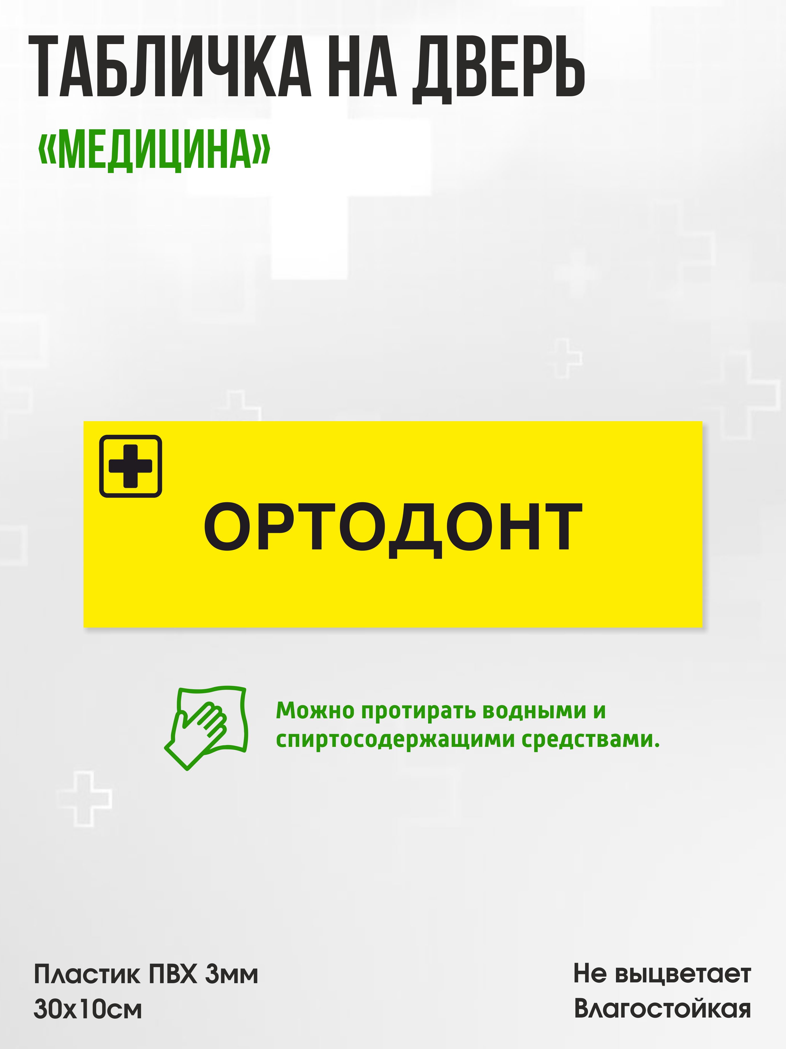 Табличка Ортодонт, жёлтая, 30х10см, ПВХ пластик, на дверь, для медицинской клиники или больницы