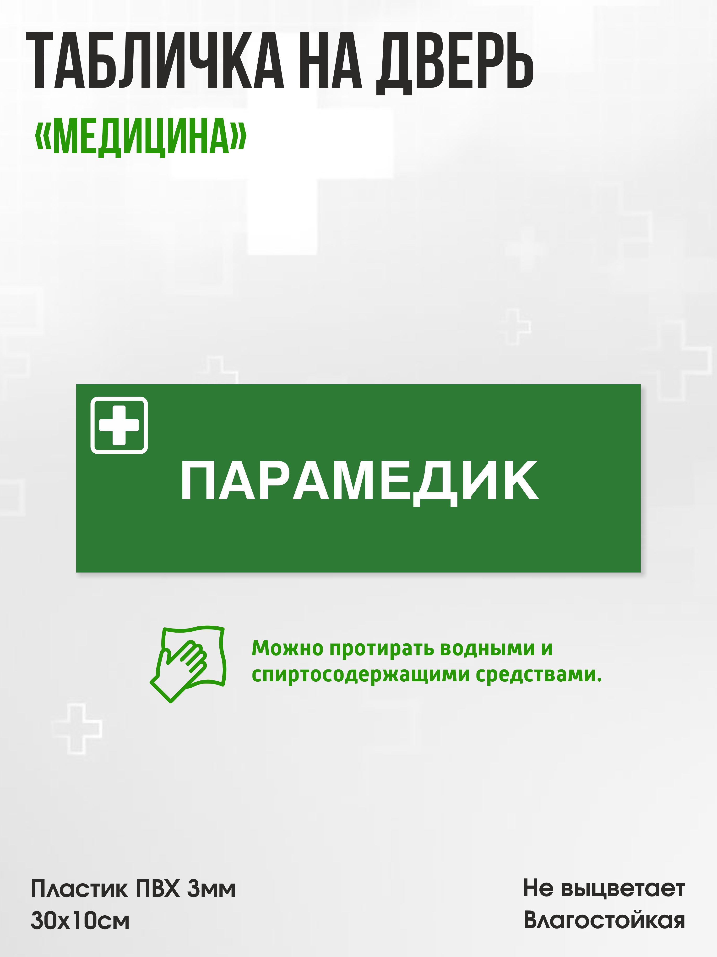 Табличка Парамедик, зеленая, 30х10см, ПВХ пластик, на дверь, для медицинской клиники или больницы