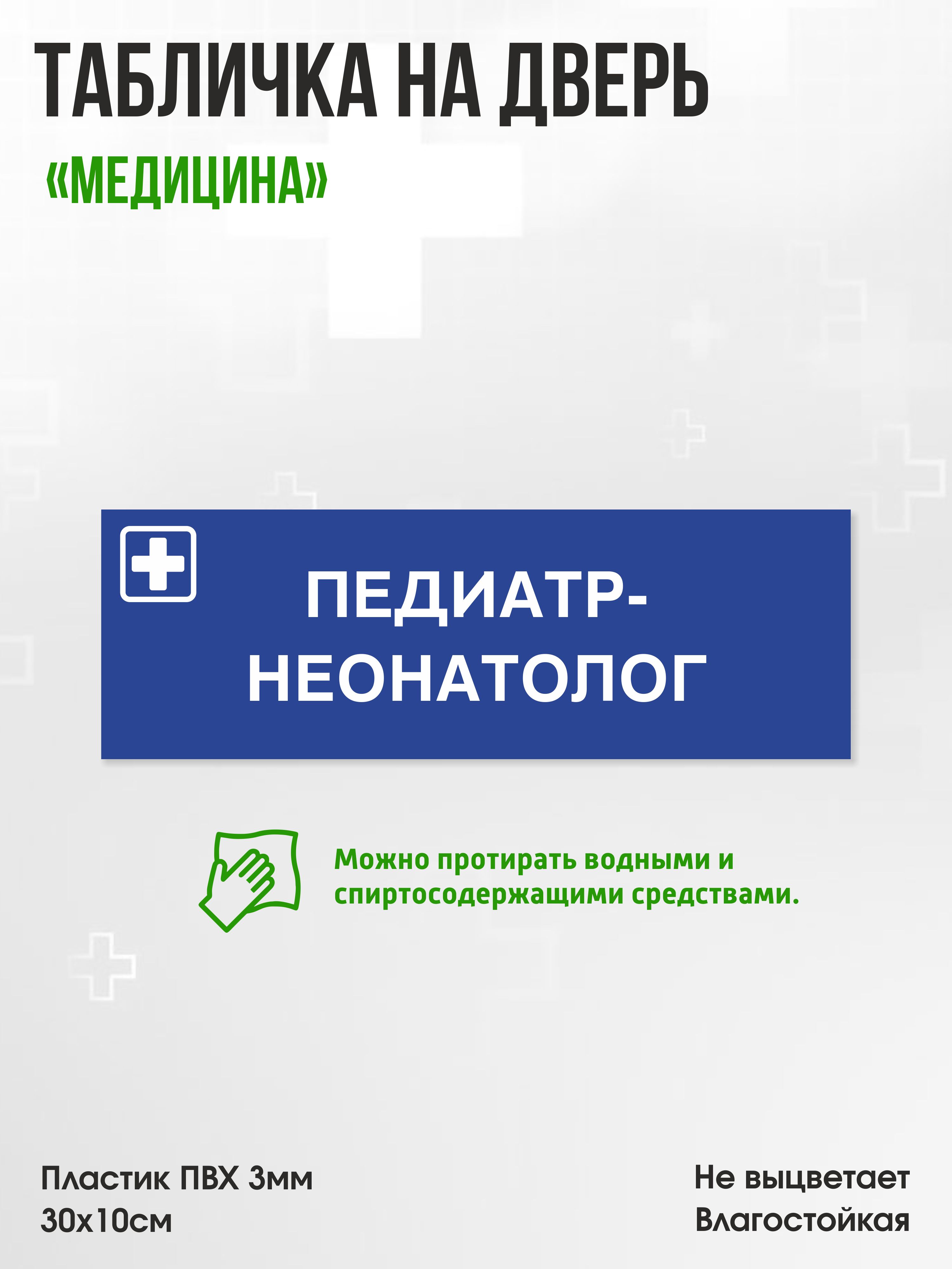 Табличка Педиатр-неонапотолог, синяя, 30х10см, ПВХ пластик, на дверь, для медицинской клиники или больницы