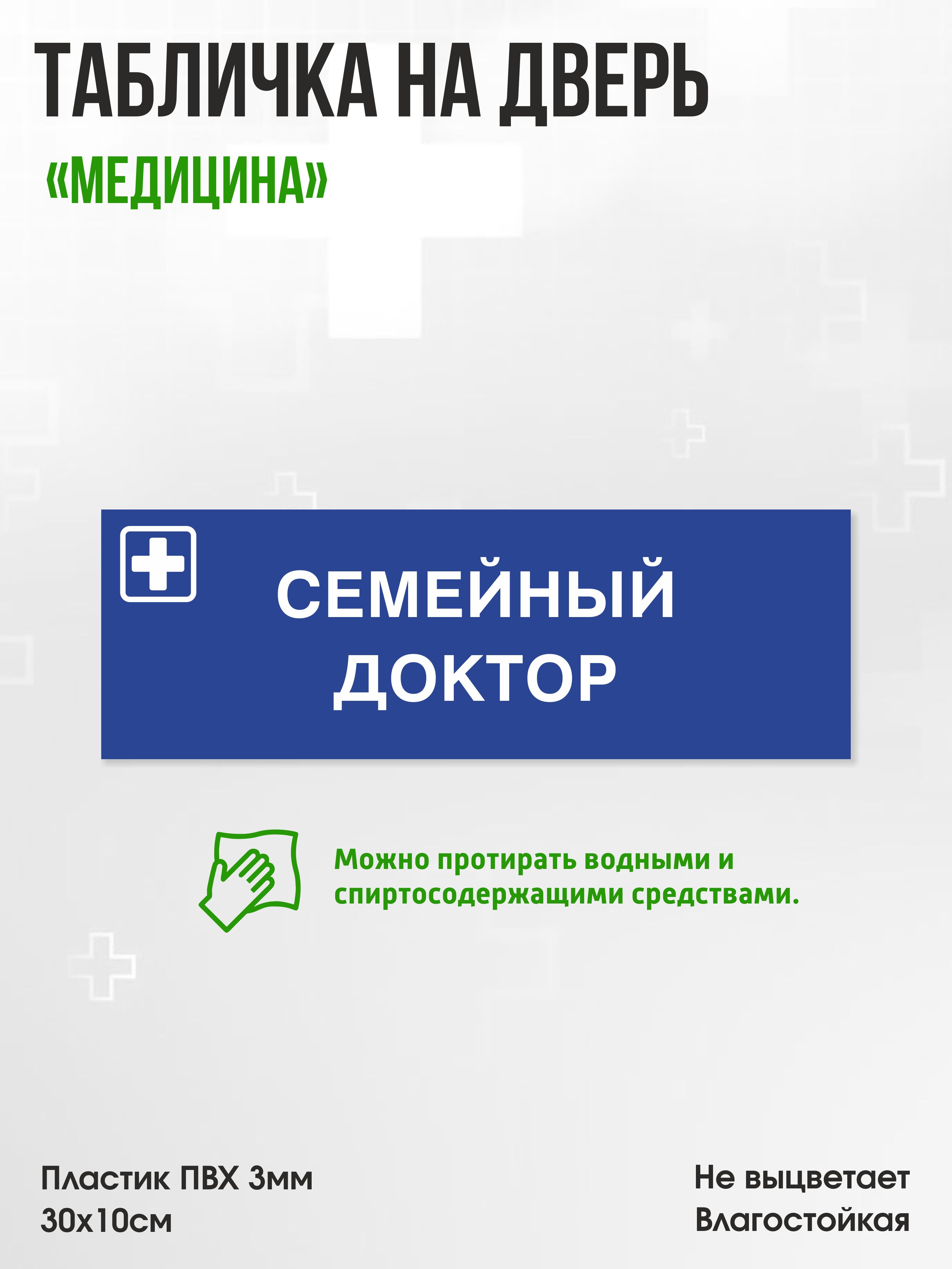 Табличка Семейный доктор, синяя, 30х10см, ПВХ пластик, на дверь, для медицинской клиники или больницы