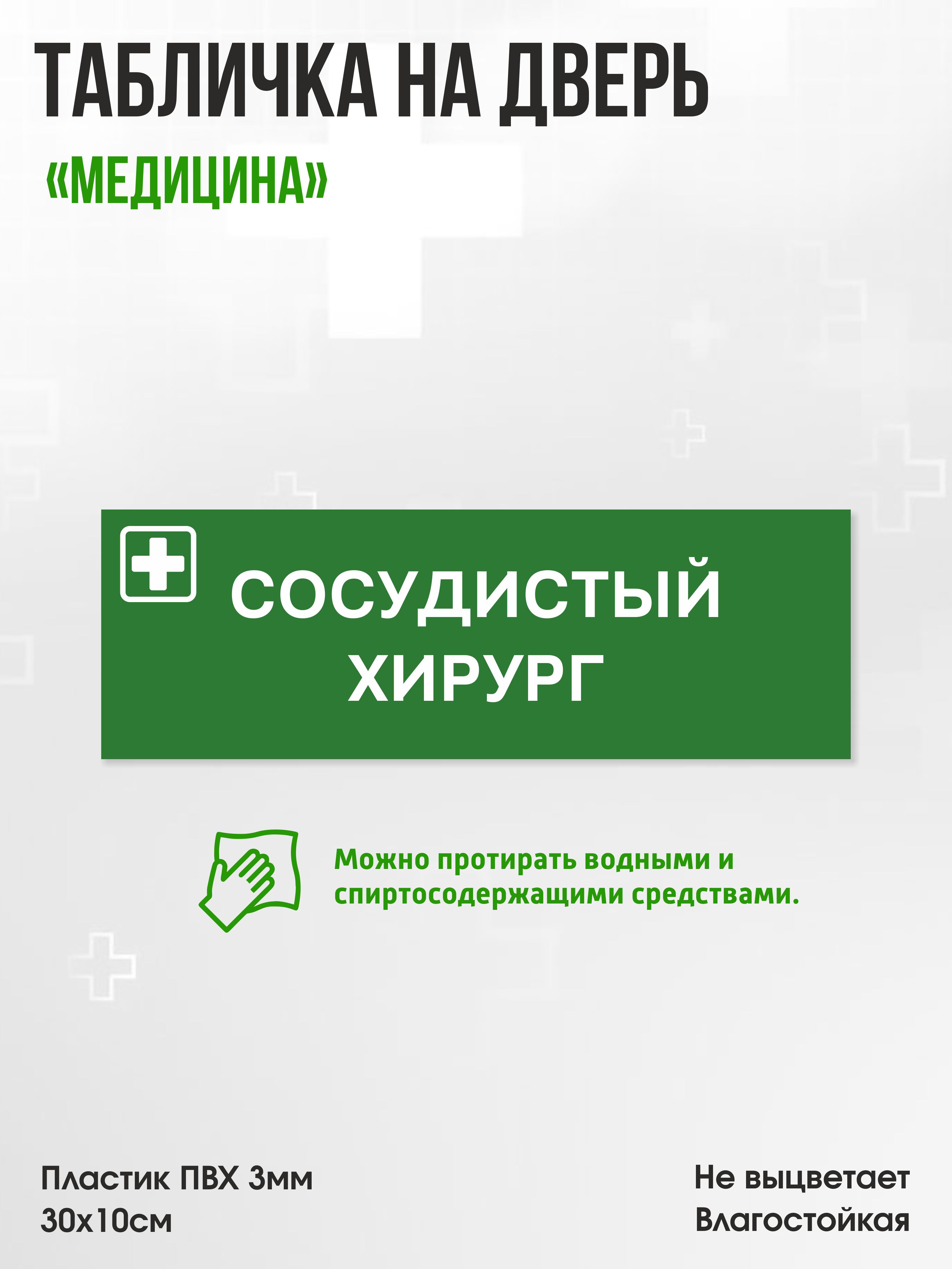 Главная / Каталог продукции / Таблички и декор / Табличка Сосудистый хирург, зеленая, 30х10см, ПВХ пластик, на дверь, для медицинской клиники или больницы