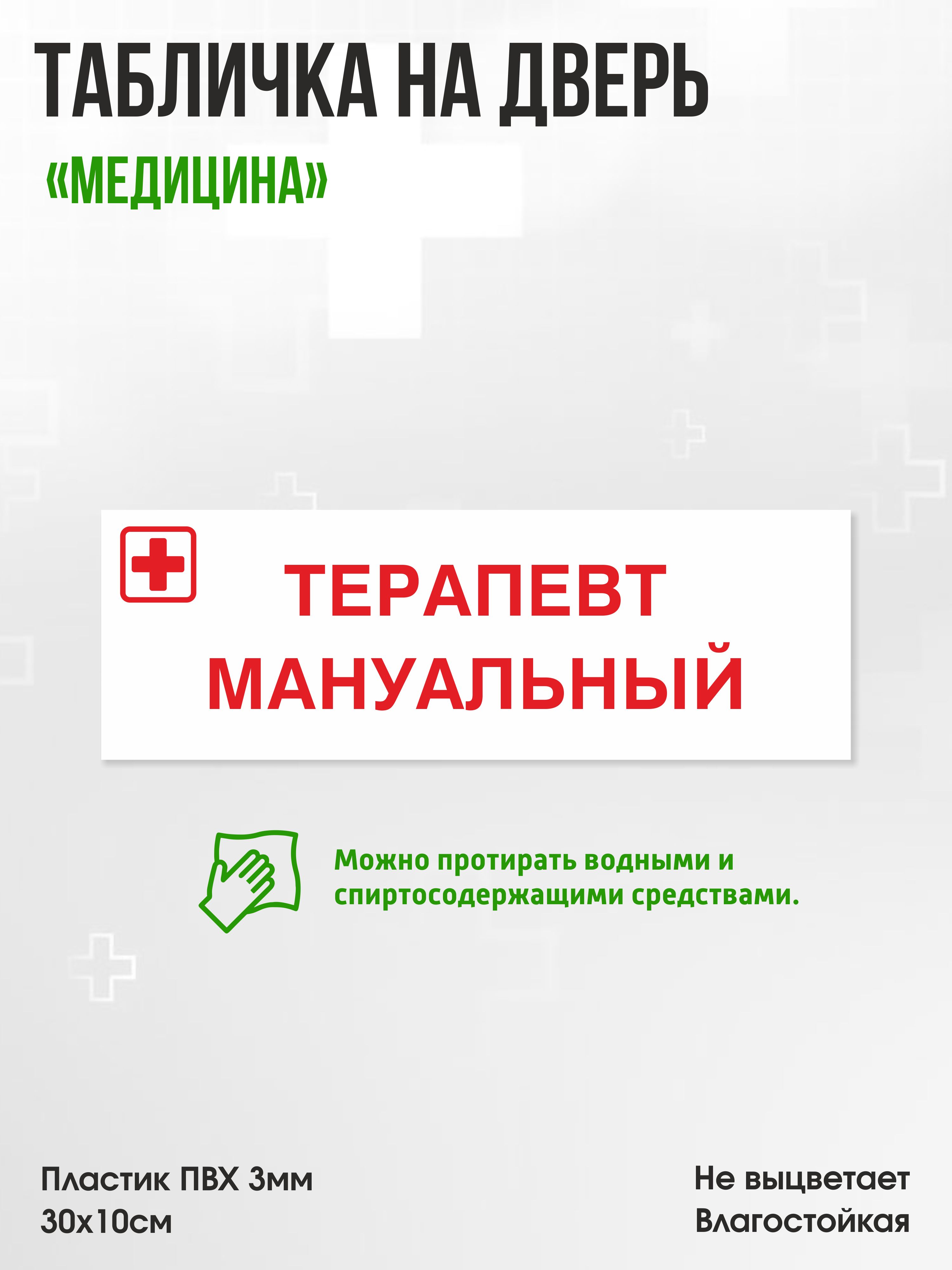 Табличка Терапевт мануальный, белая, 30х10см, ПВХ пластик, на дверь, для медицинской клиники или больницы