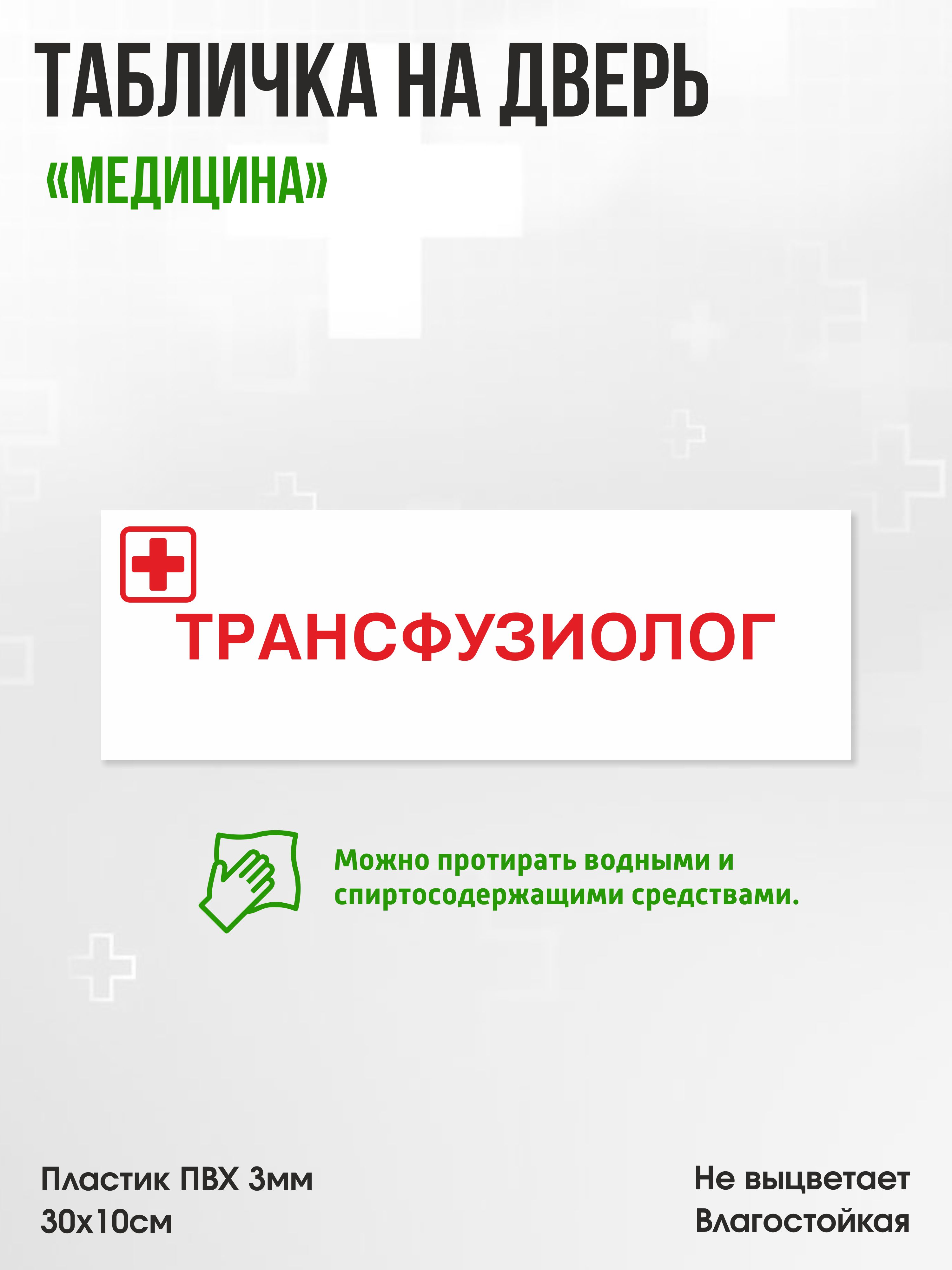 Табличка Трансфузиолог, белая, 30х10см, ПВХ пластик, на дверь, для медицинской клиники или больницы