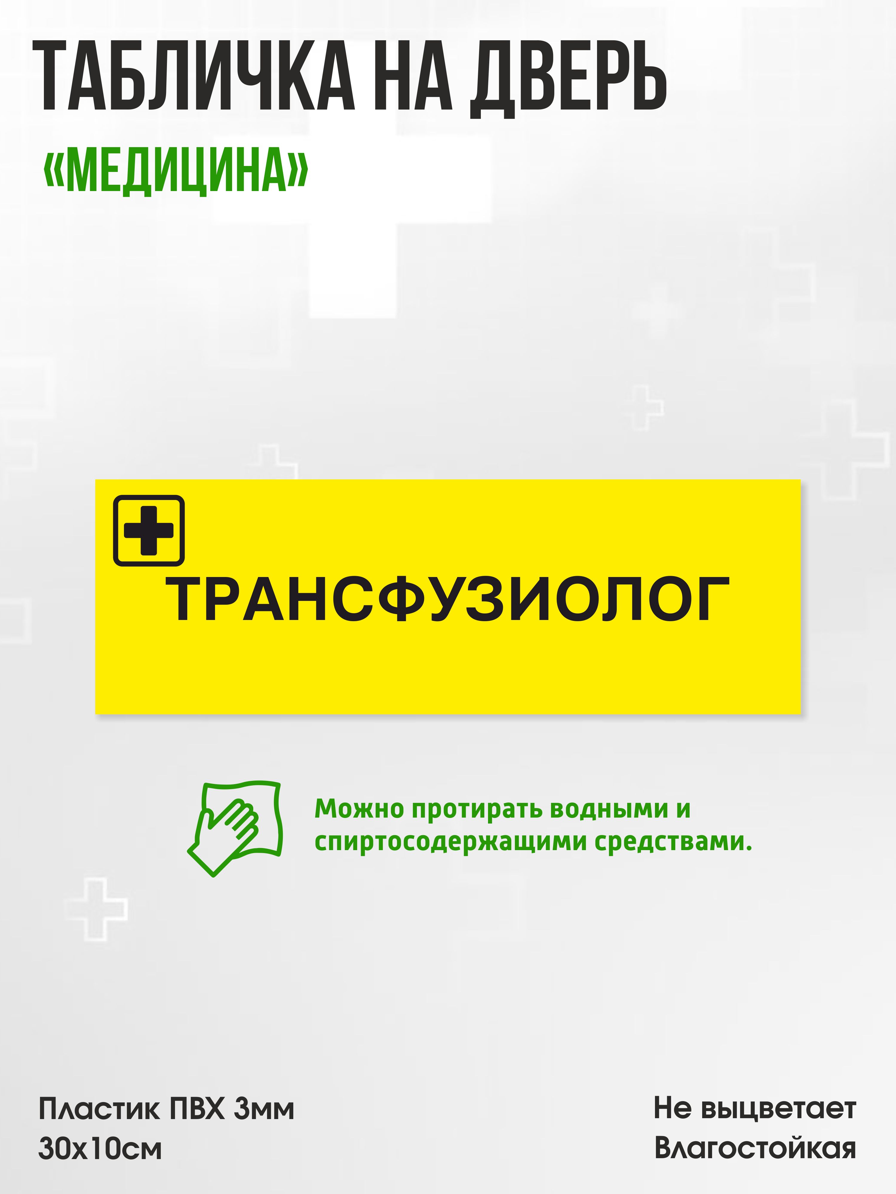 Табличка Трансфузиолог, жёлтая, 30х10см, ПВХ пластик, на дверь, для медицинской клиники или больницы