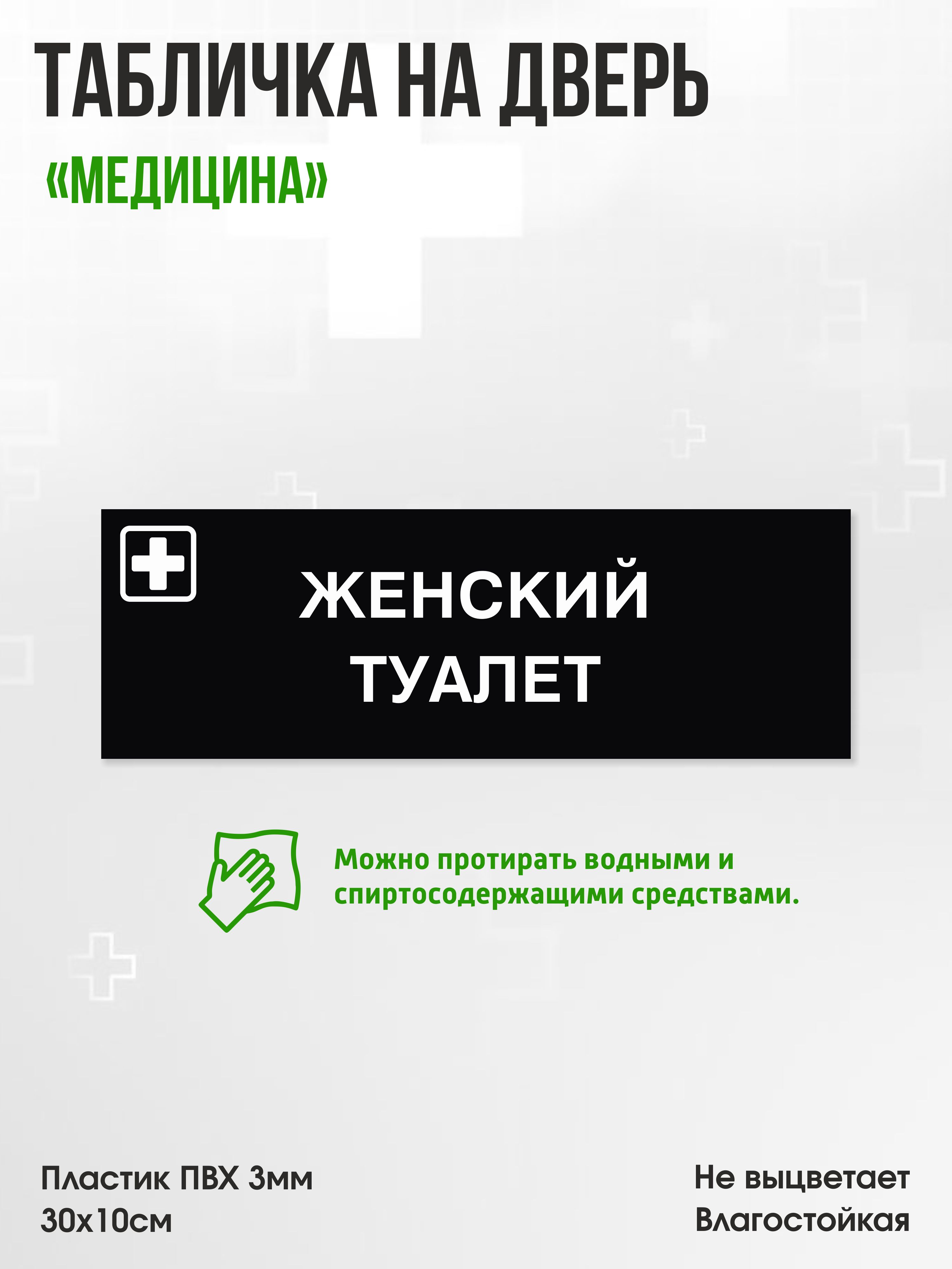 Табличка Женский туалет, черная, 30х10см, ПВХ пластик, на дверь, для медицинской клиники или больницы