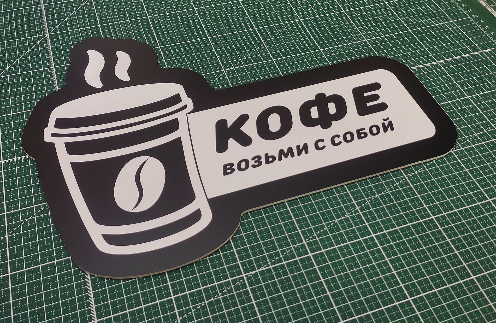 Главная / Каталог продукции / Вывески и оформление торговых точек / Вывеска фигурная "Кофе возьми с собой", из ПВХ пластика 3мм, для кофейни и вендингового автомата