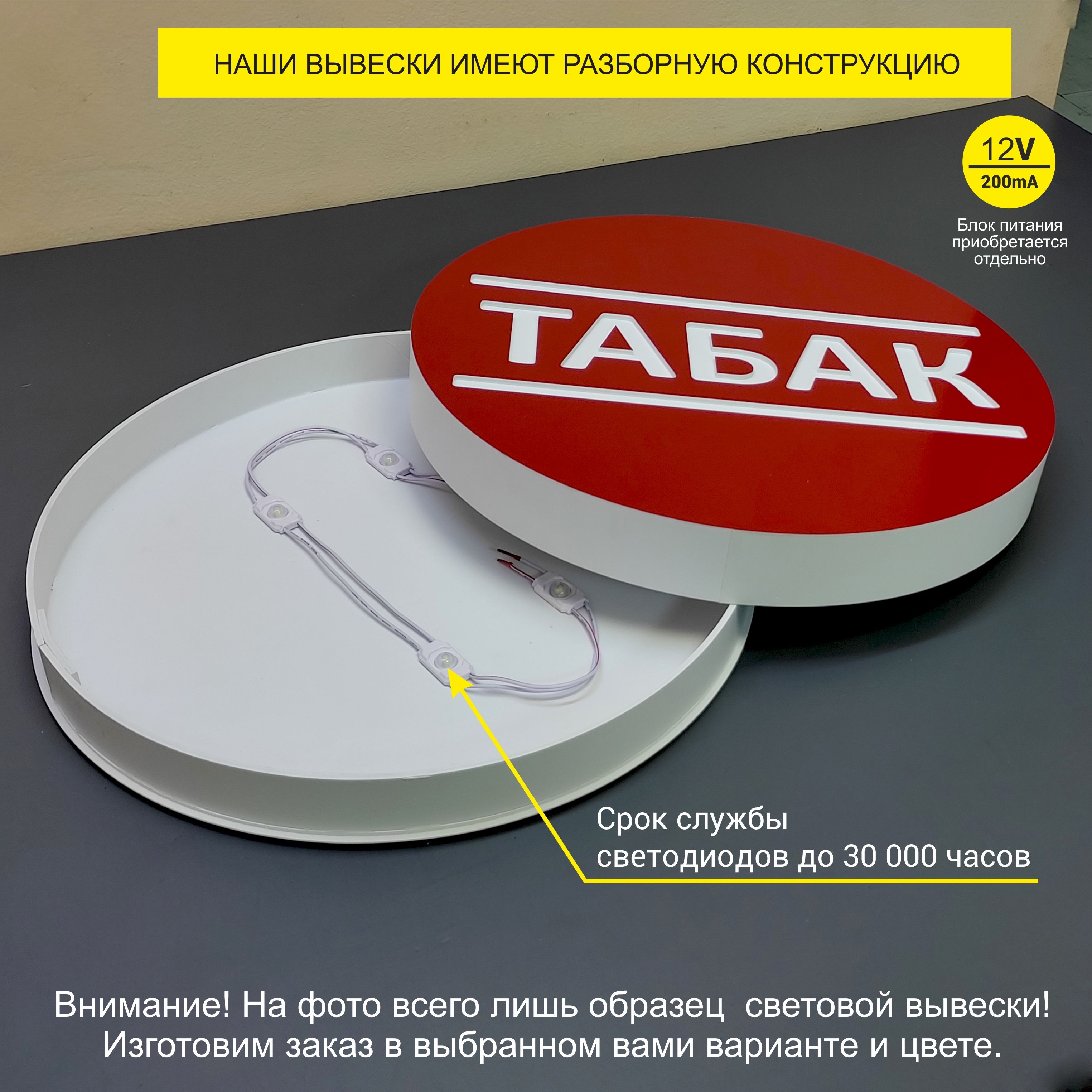 Вывеска питается от постоянного тока 12 вольт или АКБ, блок питания необходимо приобретать отдельно (подойдет любой блок питания 12в силой тока от 200mA).