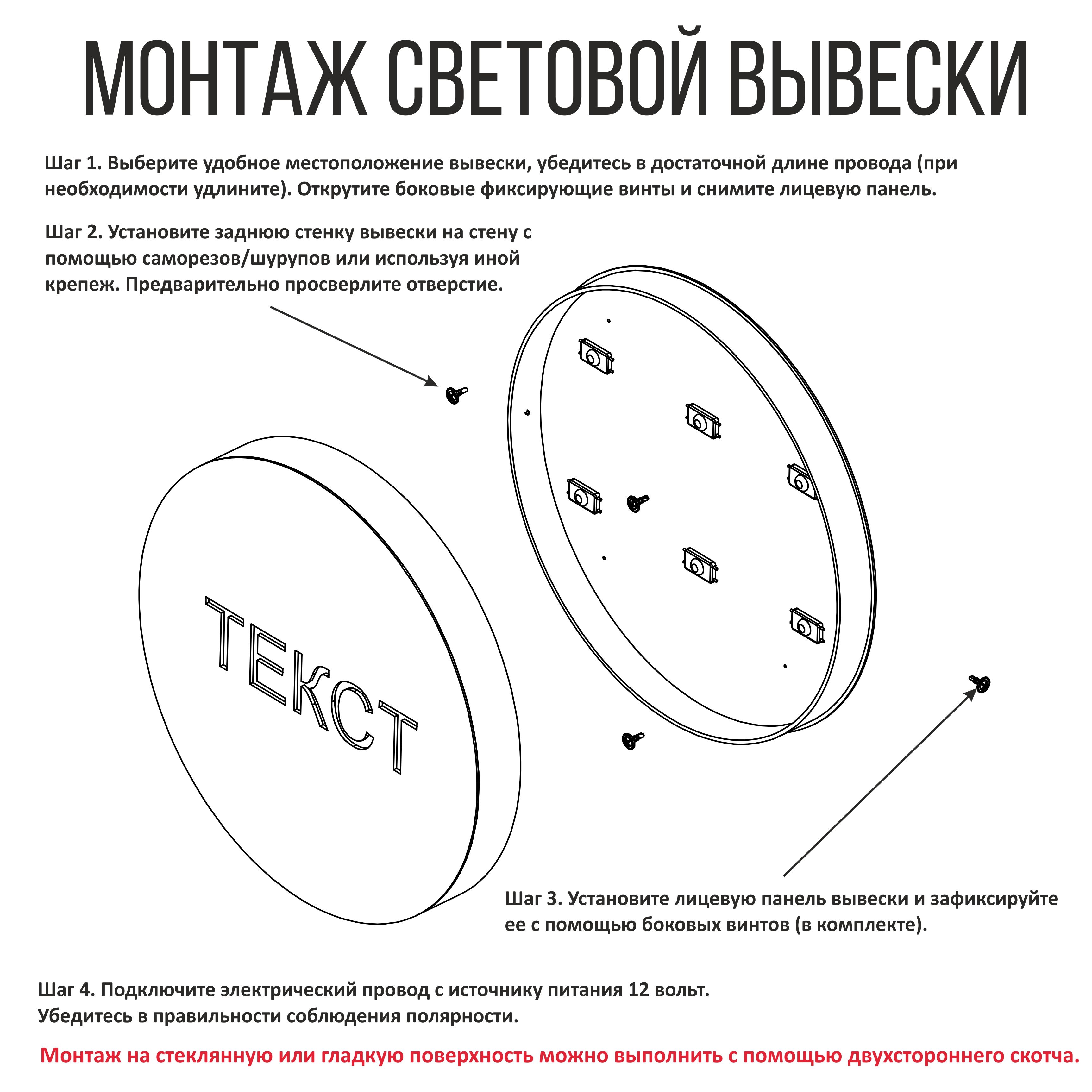 Вывеска имеет разборную конструкцию, вы сможете легко смонтировать заднюю часть к стене с помощью саморезов и установить лицевую панель. Для монтажа к стеклянной или другой любой гладкой поверхности можно воспользоваться двухсторонним скотчем.